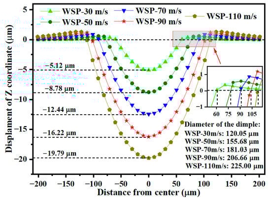 Previous research has extensively examined the effects of SP parameters [,,,,,]. This work focuses specifically on the influence of velocity (Section 3.5) and liquid viscosity (Section 3.6) on dimple sizes and residual stresses during WSP. WSP, like conventional SP, can be performed at velocities of up to 100 m/s []. In this work, five WSP velocities were investigated: 30 m/s (WSP-30 m/s), 50 m/s (WSP-50 m/s), 70 m/s (WSP-70 m/s), 90 m/s (WSP-90 m/s), and 110 m/s (WSP-110 m/s). The models, based on Figure 3b, utilized hemispherical shots. All parameters were held constant except for velocity. For the 50 m/s condition, both complete sphere and hemisphere models were compared. The resulting dimple diameters were 163.64 μm and 155.68 μm, respectively, with a difference of 4.86%. The maximum residual compressive stresses were 1364.13 MPa and 1267.83 MPa, respectively, with a difference of 7.06%. Both models produced similar numerical results and demonstrated consistent trends. Due to its lower computational cost, the hemispherical model was selected for further analysis of velocity parameters. As velocity increased from 30 m/s to 110 m/s, dimple depth increased from 5.12 μm to 19.79 μm, and dimple diameter increased from 120.05 μm to 225.00 μm (Figure 15).