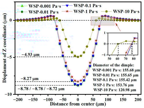 During WSP, the high-velocity mixture of shot and liquid impacts the target. The influence of liquid viscosity on WSP performance requires a detailed investigation. Liquids with excessively high viscosity exhibit poor fluidity and are unsuitable for the wet blasting process. This study examines five viscosities: 0.001 Pa·s (WSP-0.001 Pa·s), 0.01 Pa·s (WSP-0.01 Pa·s), 0.1 Pa·s (WSP-0.1 Pa·s), 1 Pa·s (WSP-1 Pa·s), and 10 Pa·s (WSP-10 Pa·s). All models maintain identical parameters except for viscosity and utilize the same hemispherical geometry described in Section 3.5. Figure 18 presents the effect of liquid viscosity on the dimple size of the target. Dimple size is almost unchanged when the viscosity ranges from 0.001 to 0.1 Pa·s. Increasing viscosity from 0.1 Pa·s to 1 Pa·s results in minor changes: dimple depth decreases by 5.16% and dimple diameter decreases by 1.07%. When viscosity increases from 1 Pa·s to 10 Pa·s, dimple size changes substantially, with crater depth decreasing by 40.38% and crater diameter decreasing by 21.32%.