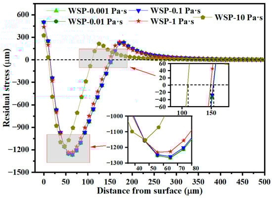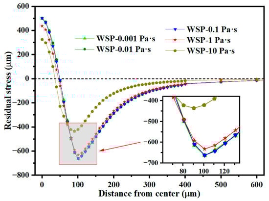Residual stress distributions in the radial direction of dimples for different viscosities.