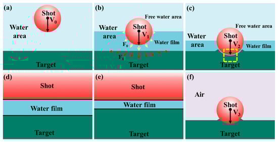 The schematic diagram of water film formation is drawn in Figure 21 based on the above results and analysis. Firstly, the mixture of shot and water rushes to the target surface at a particular velocity of V0 (Figure 21a). Then, as the mixture approaches the target surface, the shot velocity drops to V1 due to the obstructive effect of the target. At this point, the water can be divided into two parts: the water film between the shot and the target (also named part A in Section 3.2), and the free water area (also named part B in Section 3.2). The water film not only impacts the target by its kinetic energy but also transfers the energy from the shot to the target (Figure 21b). After that, the shot hits the target surface with a co-product of a dimple. Meanwhile, the water film thickness changes to microscale (Figure 21c). Figure 21d,e are the enlarged views of the yellow dashed box in Figure 21c. The water film thickness changes with time and position (Figure 21d,e). Figure 21f is the schematic diagram of the dimple created by SP.