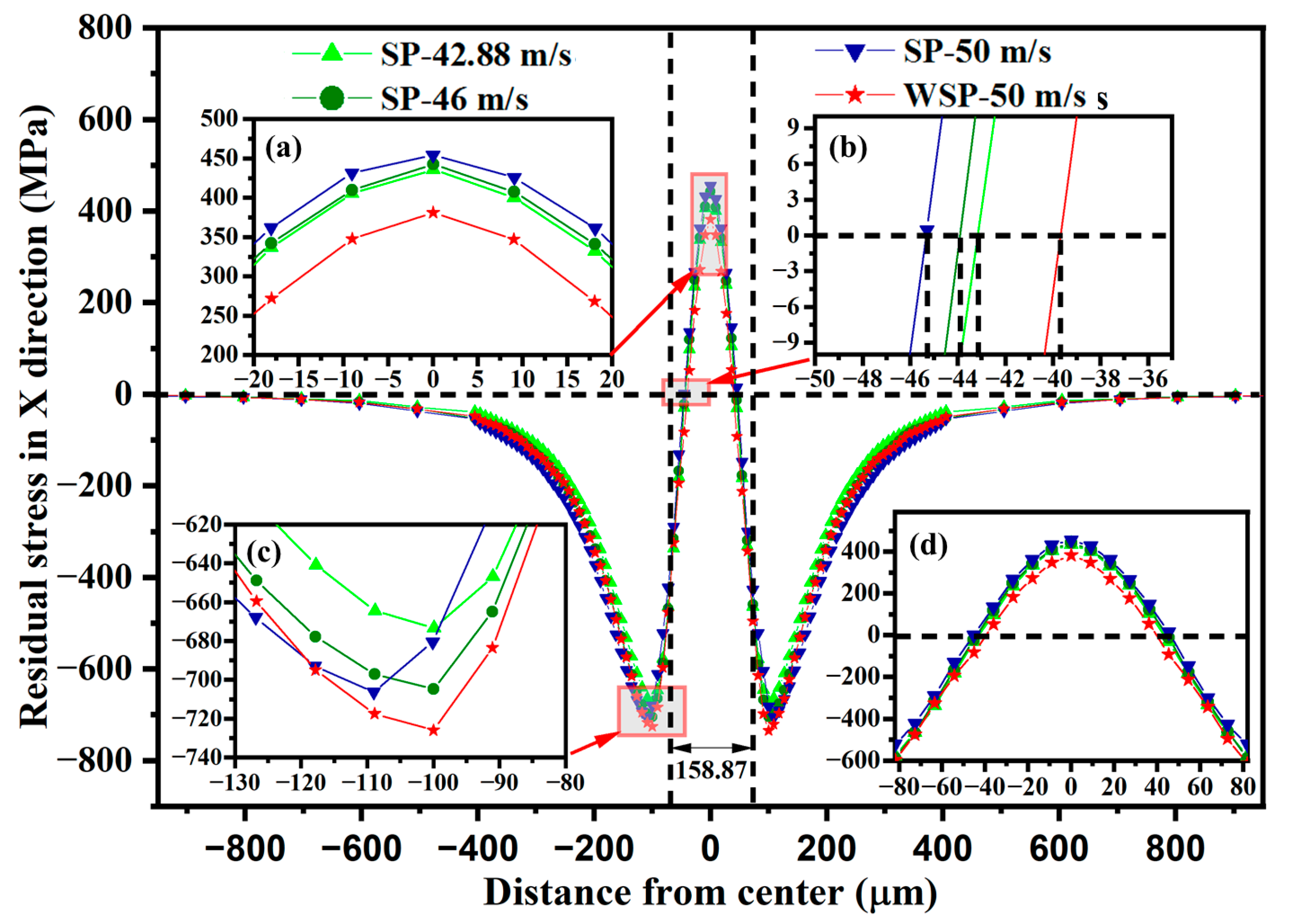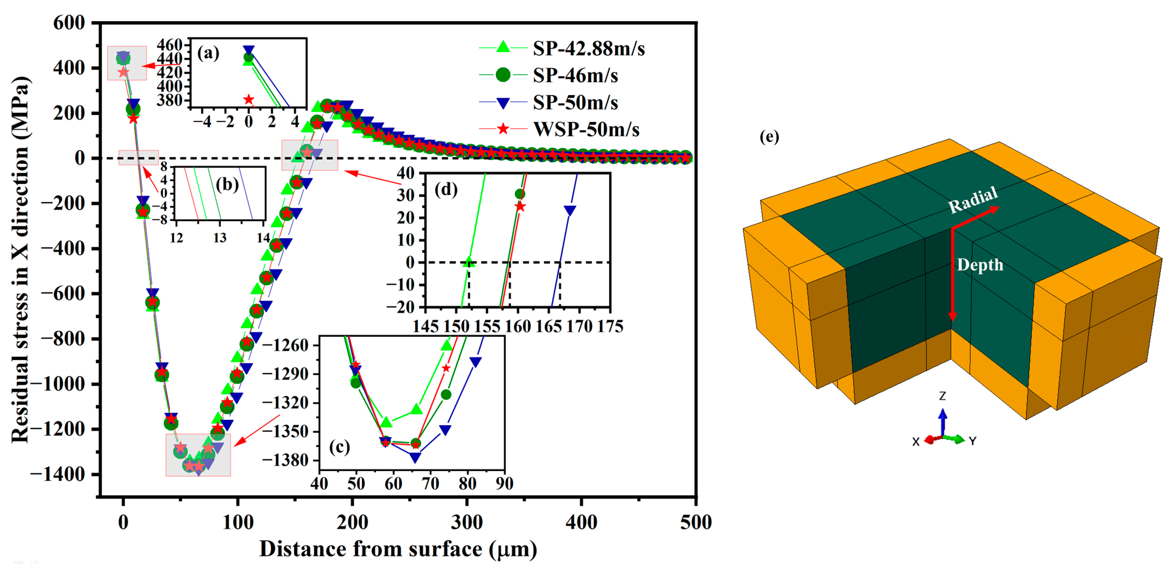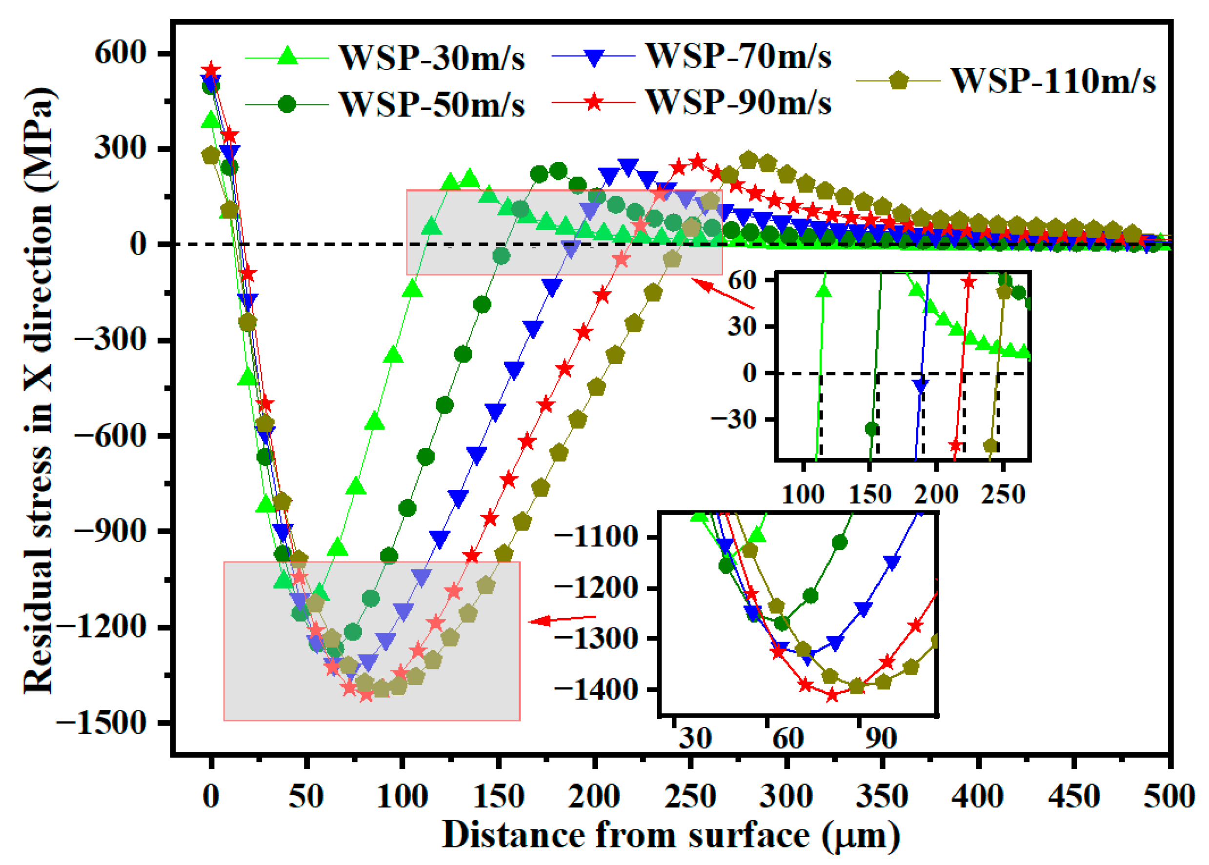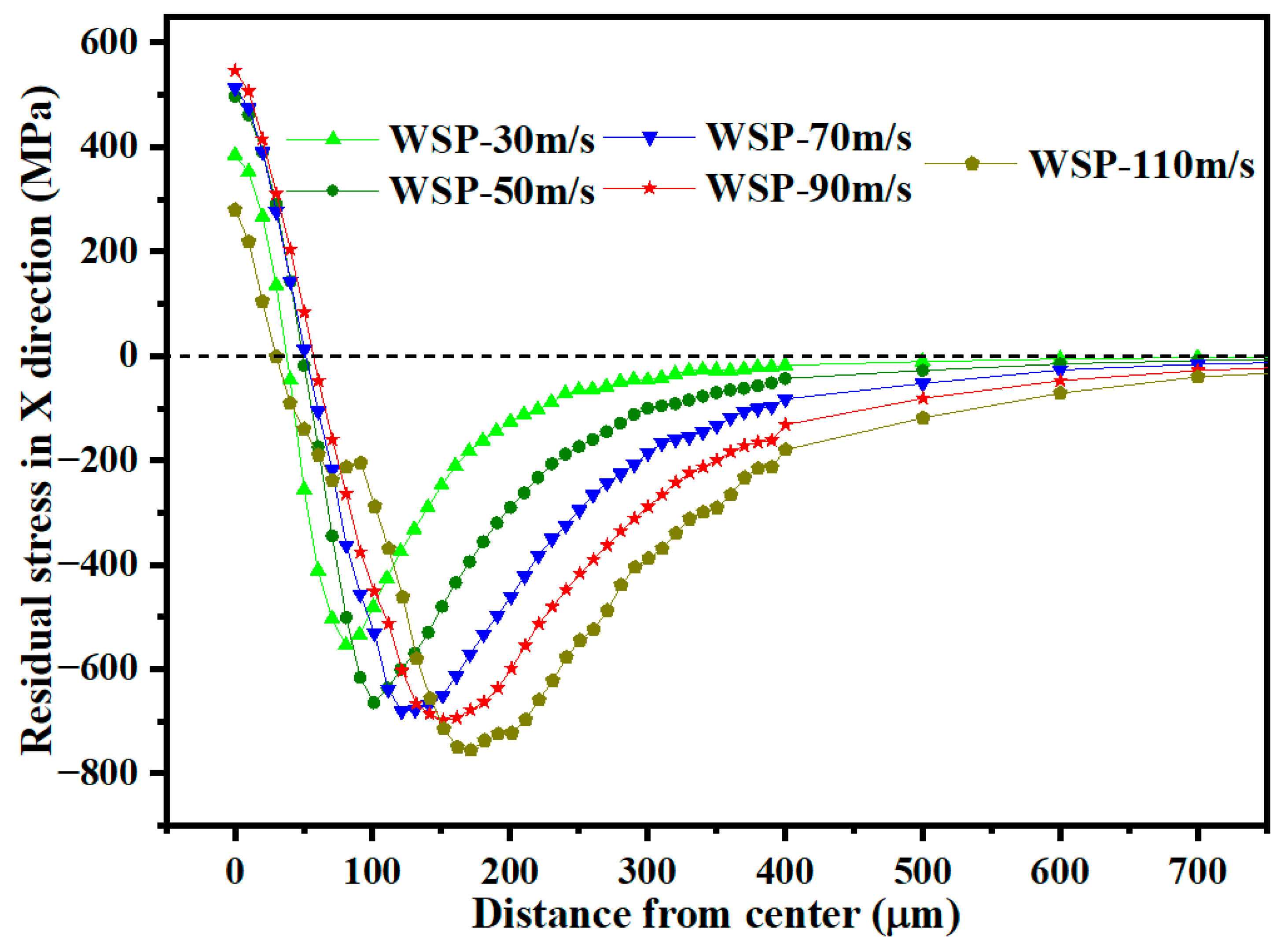 - The σRS2 increases as the WSP velocity rises from 30 m/s to 90 m/s. At 110 m/s, the σRS2 decreases relative to 90 m/s. Therefore, 90 m/s is identified as the optimal velocity parameter for maximizing residual compressive stress.