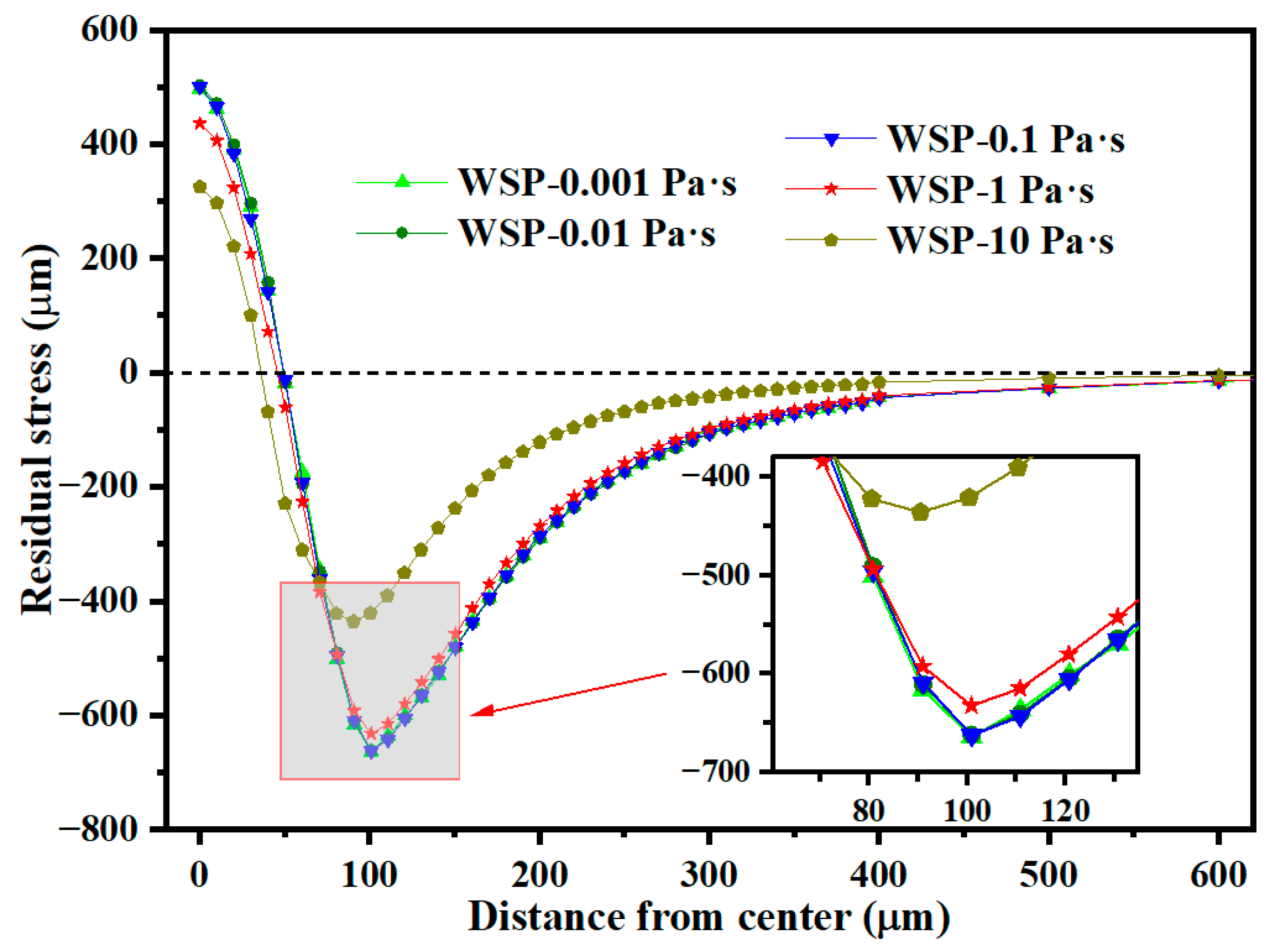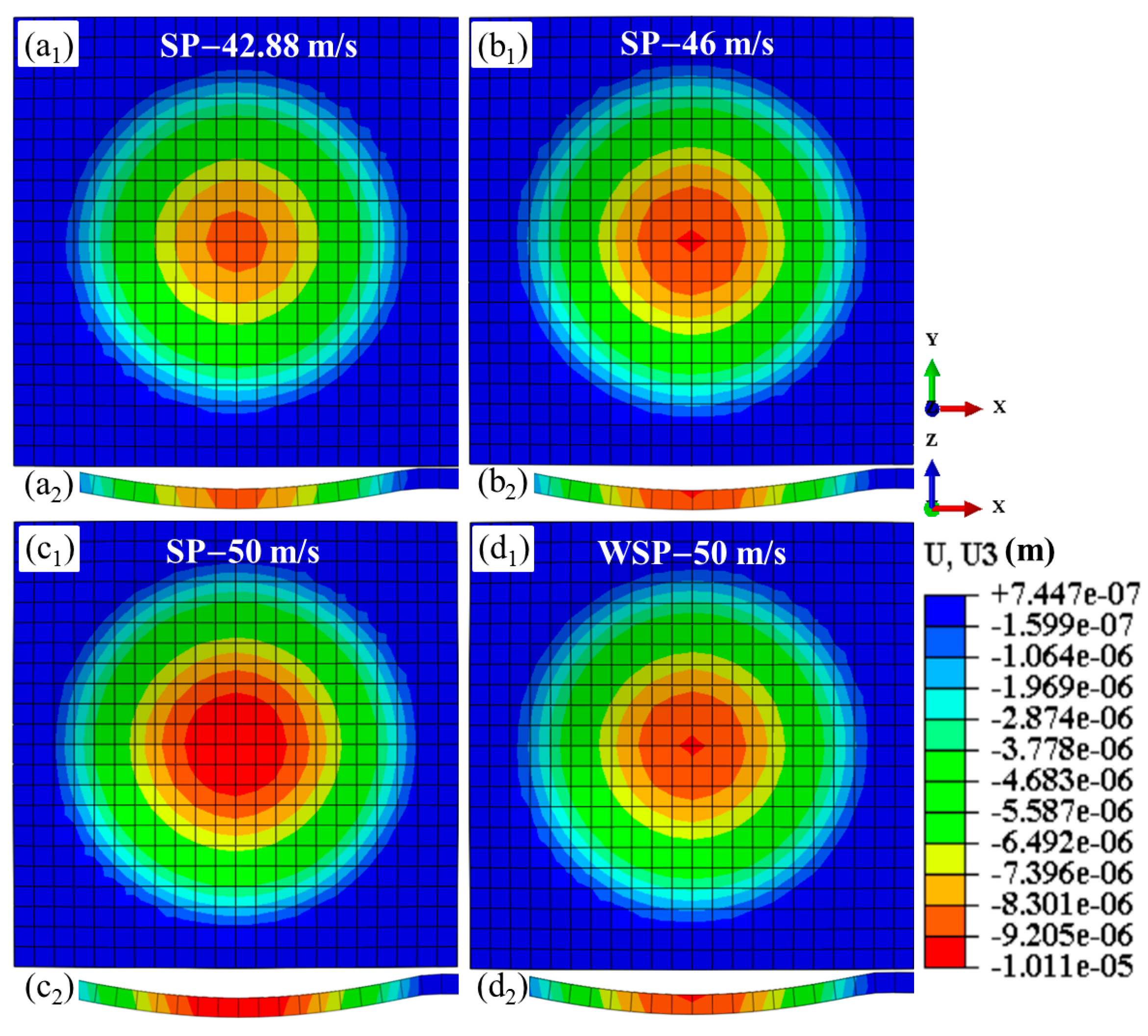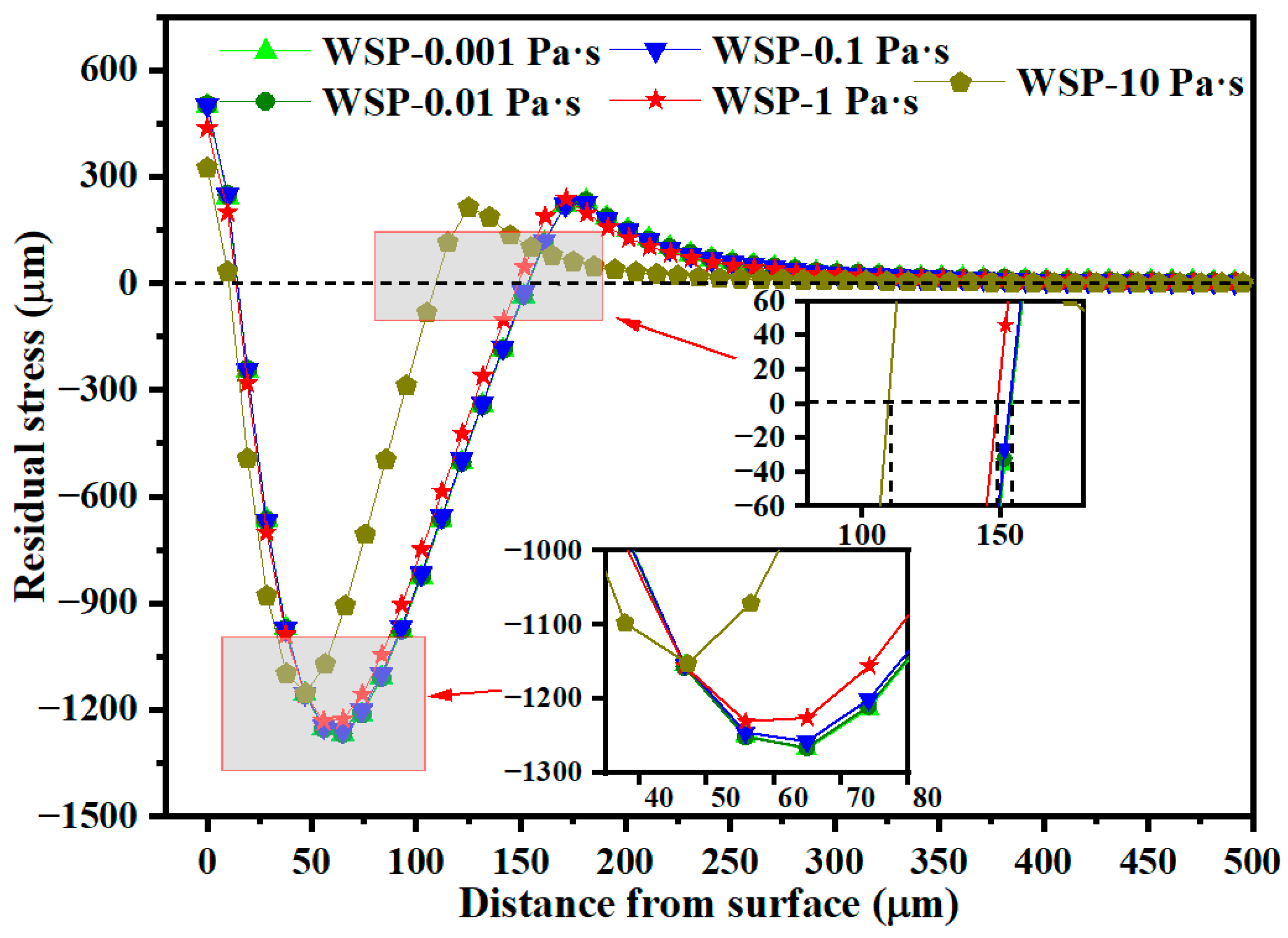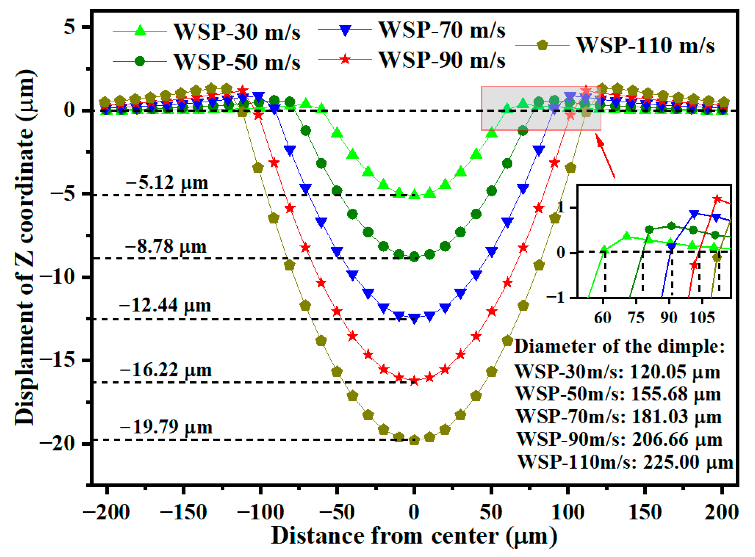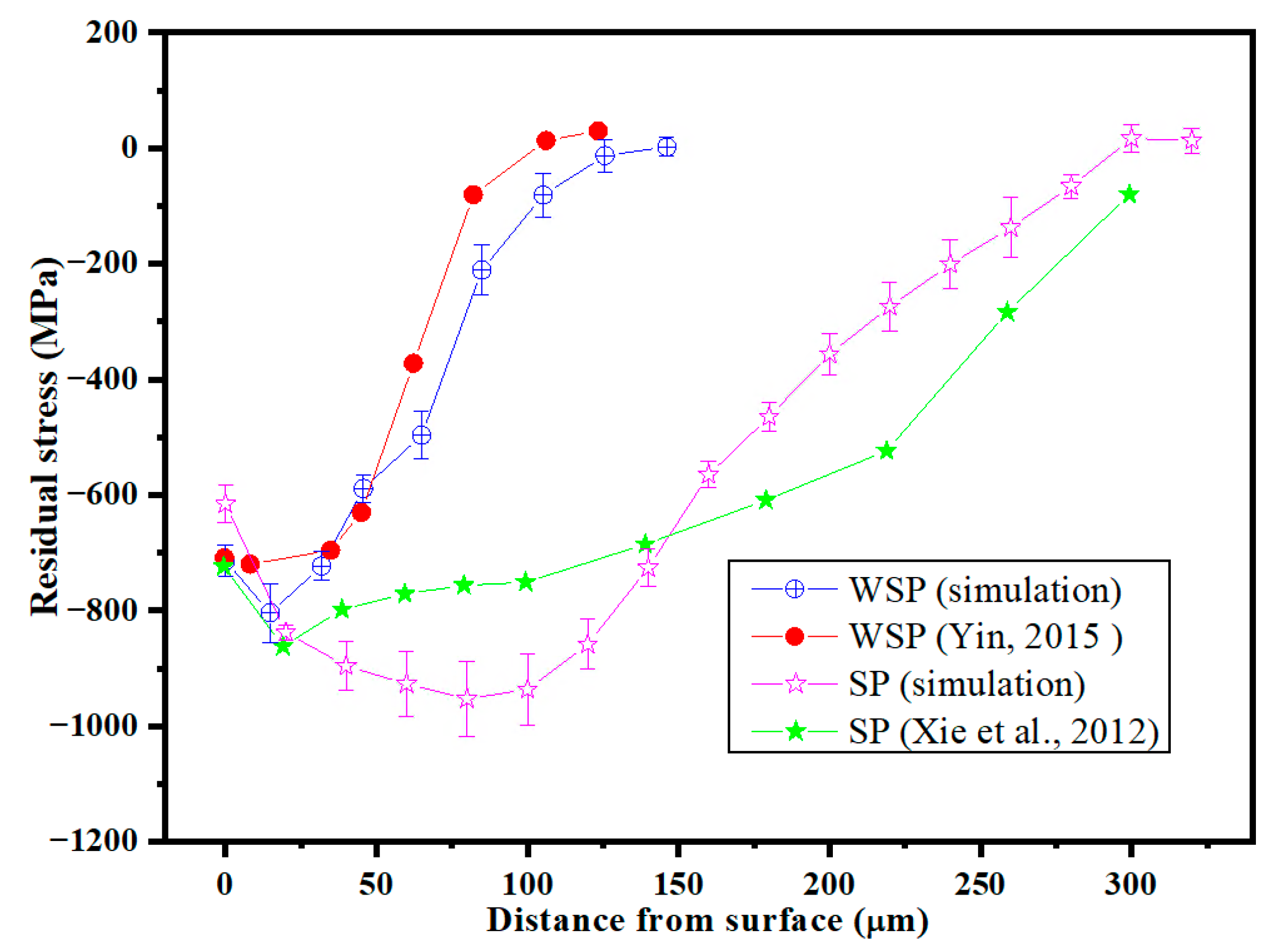 - The σRS2 increases as the WSP velocity rises from 30 m/s to 90 m/s. At 110 m/s, the σRS2 decreases relative to 90 m/s. Therefore, 90 m/s is identified as the optimal velocity parameter for maximizing residual compressive stress.