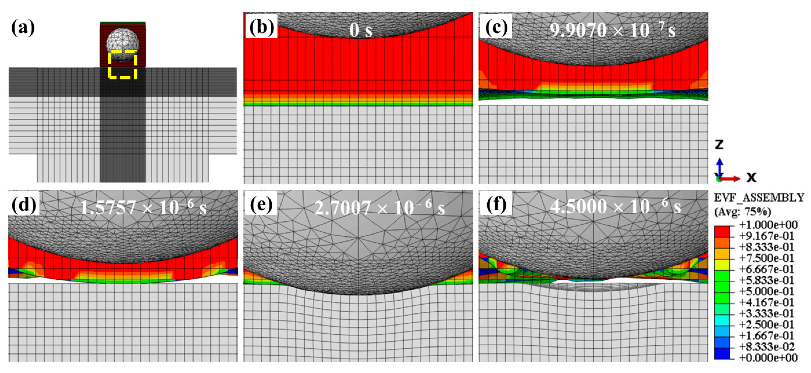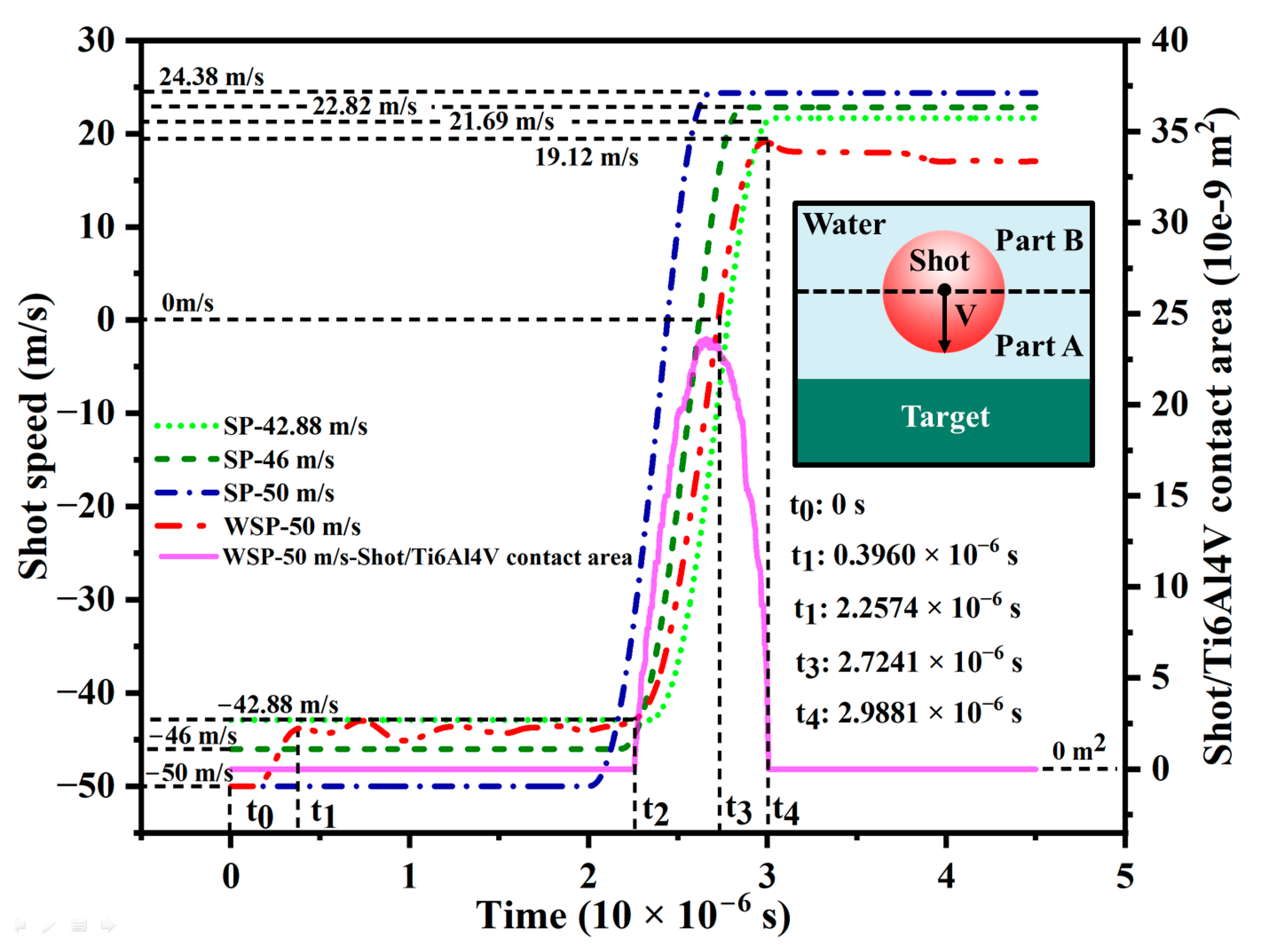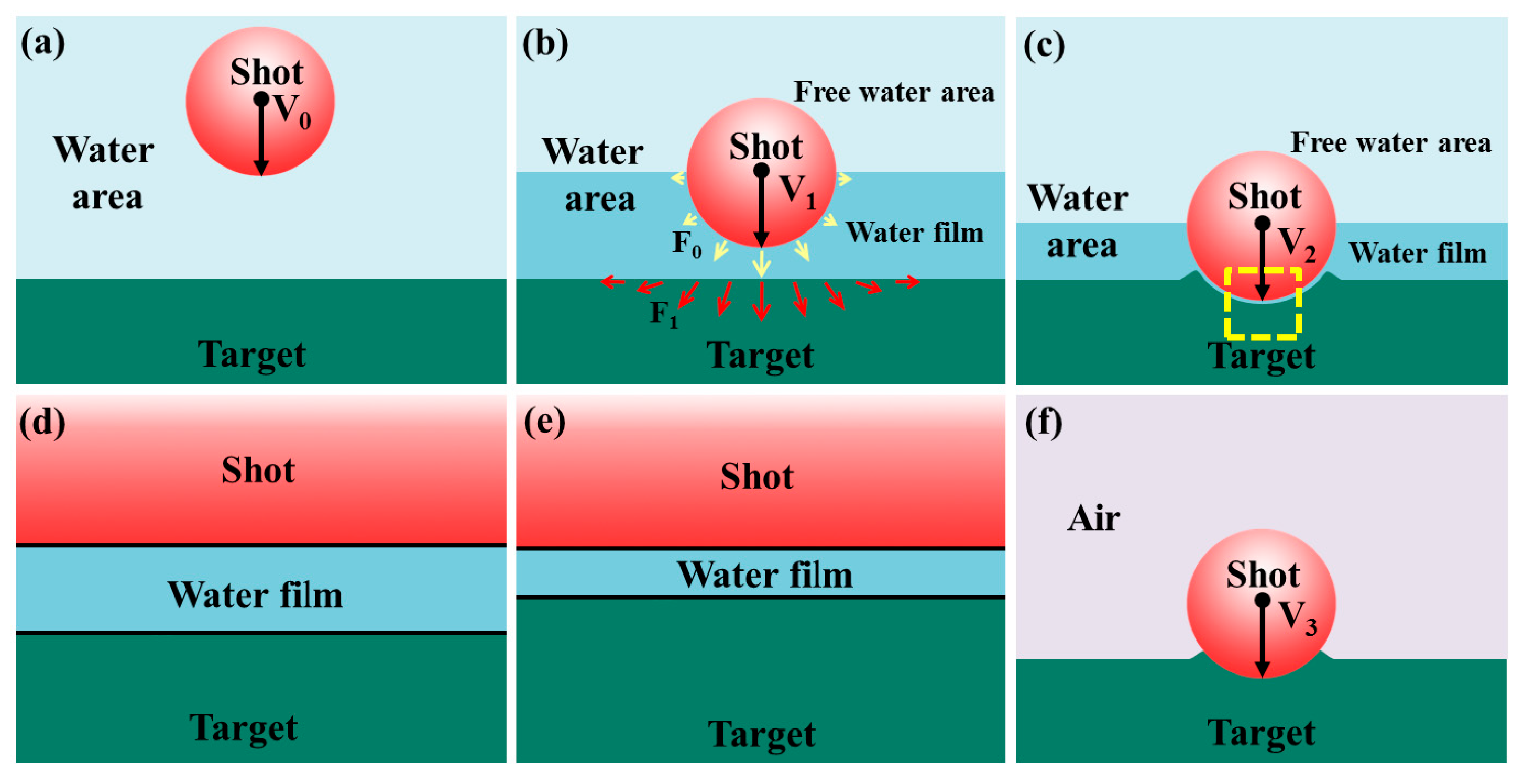 - This work provides the first comprehensive modeling of the water-film effect using the CEL method during WSP. The water film thickness is at a microscale under the following conditions: the shot is made of ceramic with a diameter of 0.6 mm, the target is made of Ti6Al4V, and the initial velocity is 50 m/s.