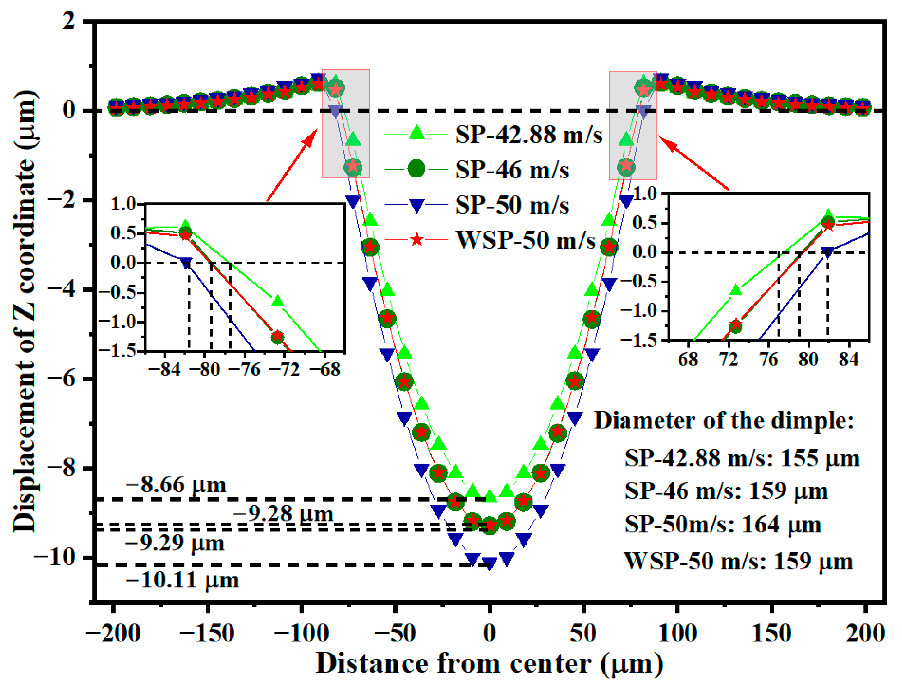 - Water film induced by WSP affects the residual stress distribution in the target’s surface layer. WSP can obtain lower σRS1 and thinner D1 in the depth direction. Compared with σRS1 and D1 of SP-46 m/s, those of WSP-50 m/s are 13.89% smaller and 4.19% thinner, respectively. In the radial direction of the dimple, WSP can form higher σRS4, larger LCRS, and more equally distributed residual stress. The σRS4 and PCRS of WSP-50 m/s are 5.4% greater and 12.17% larger than those of SP-46 m/s, respectively. The standard deviation for the residual stress of WSP-50 m/s is 17.92 MPa smaller than that of SP-50 m/s, which means the residual stress distribution of WSP is more uniform than that of SP.