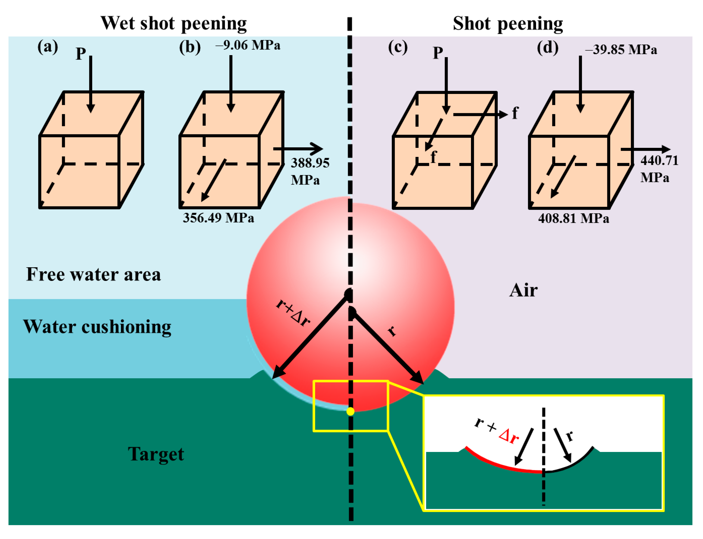 - The water film during WSP is comparable to a layer of cladding with a thickness Δr on the shot surface. When producing a dimple with a given depth, the bigger shot will create a larger-diameter dimple.