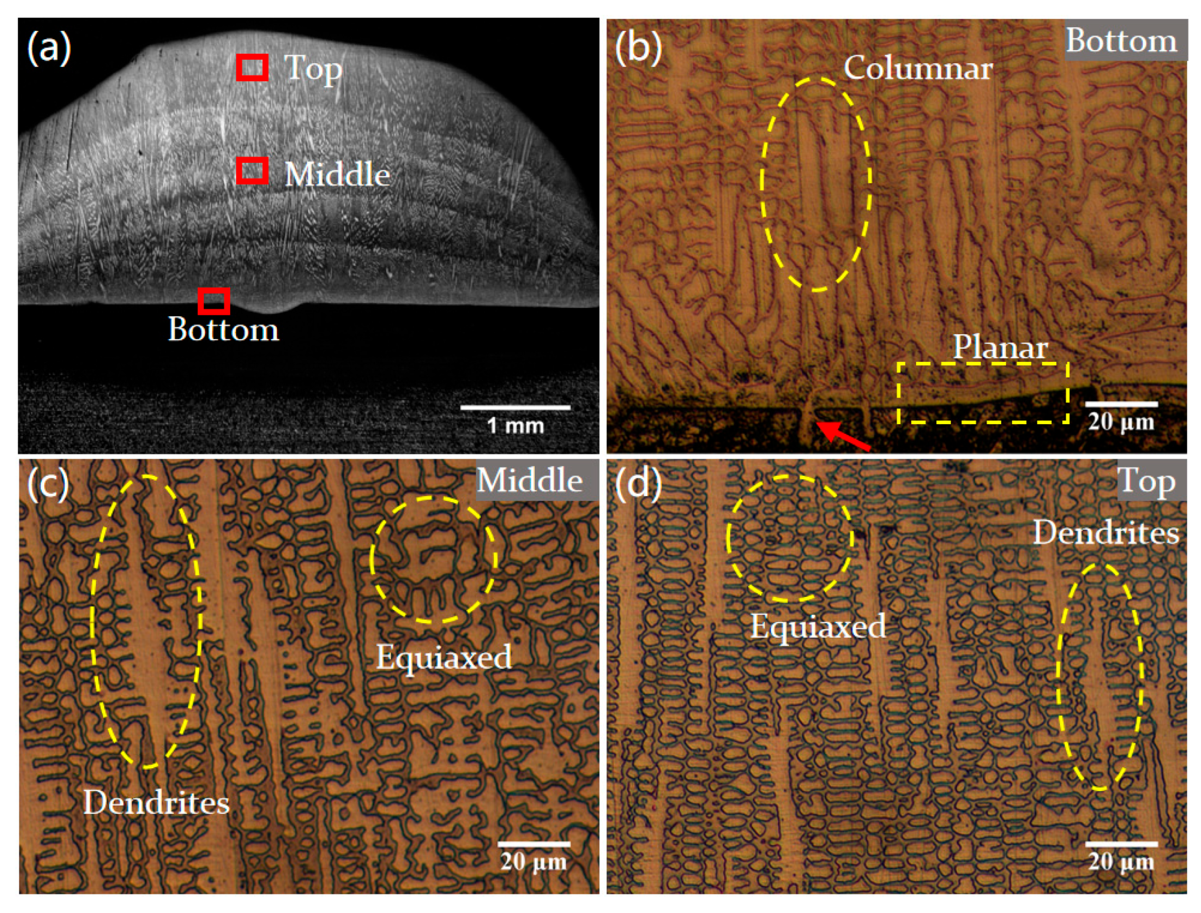 - The Fe-based cladding layer exhibits different grain morphologies and sizes throughout the cross section. Planar grains form at the interface between the substrate and the cladding layer, and coarse columnar grains can be observed perpendicular to the bonding interface. Both dendritic and equiaxial grains coexist in the middle and top regions of the cladding layer, with finer grains on the top.