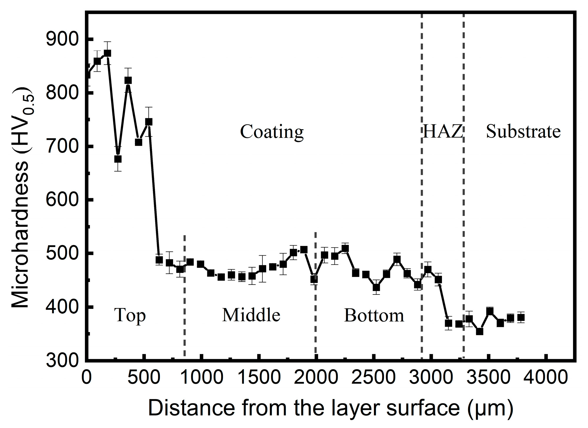 - Increasing the laser scanning speed or extending the interlayer dwell time can effectively enhance the cooling rate, resulting in appreciable improvements in coating hardness and wear resistance. The former approach demonstrates greater efficiency and effectiveness in enhancing the cooling rate. For large-part fabrication or large-area cladding, the deposition path should be rationally planned to increase the interlayer dwell time without compromising production efficiency.