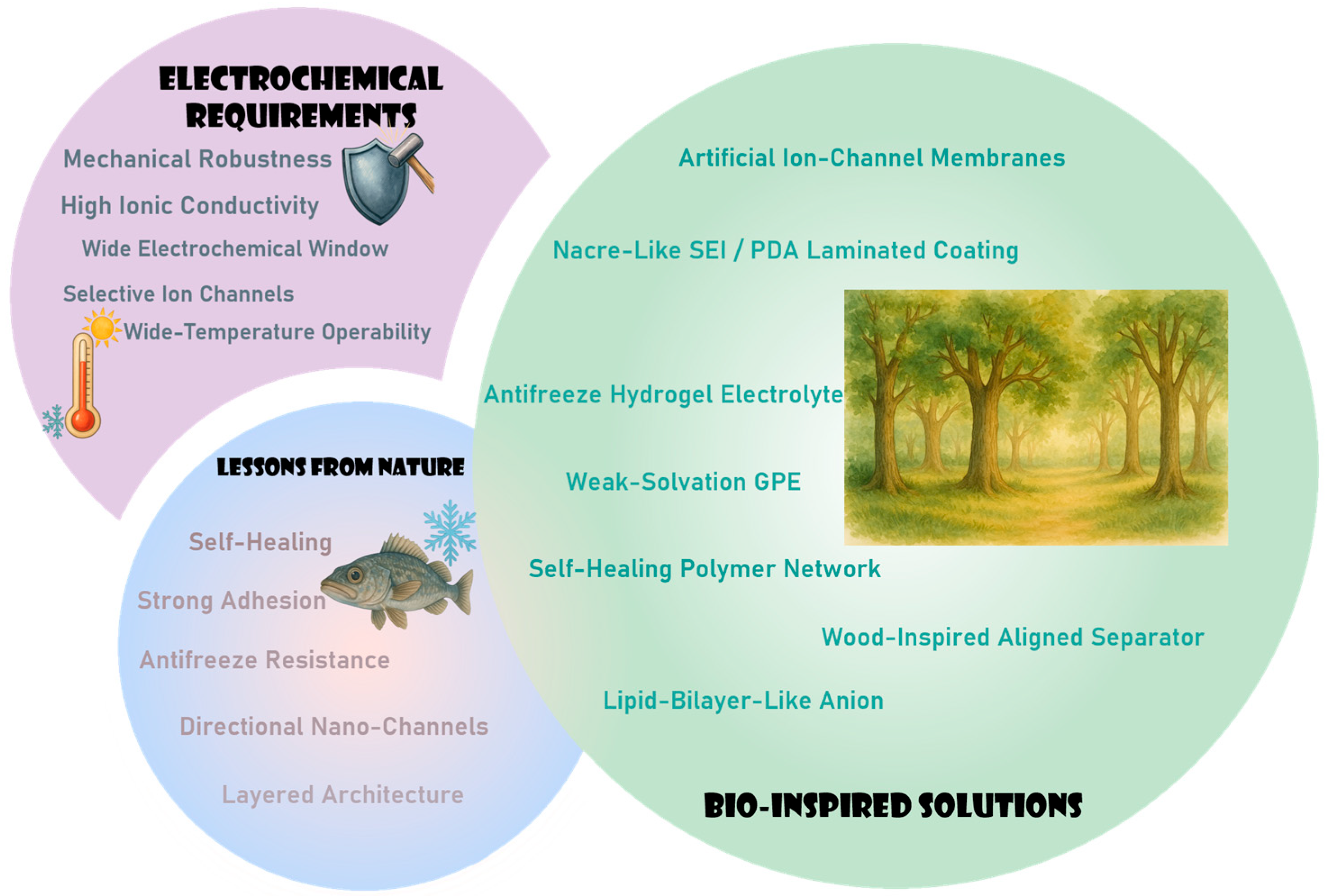 4]. To overcome these limitations, researchers have turned to biomimetic electrolyte engineering. By mimicking natural systems—such as biological membranes, ion channels, and ice-binding proteins—it is possible to design interphases that regulate ion flux, broaden the effective stability window, and maintain ionic conductivity under extreme temperatures.