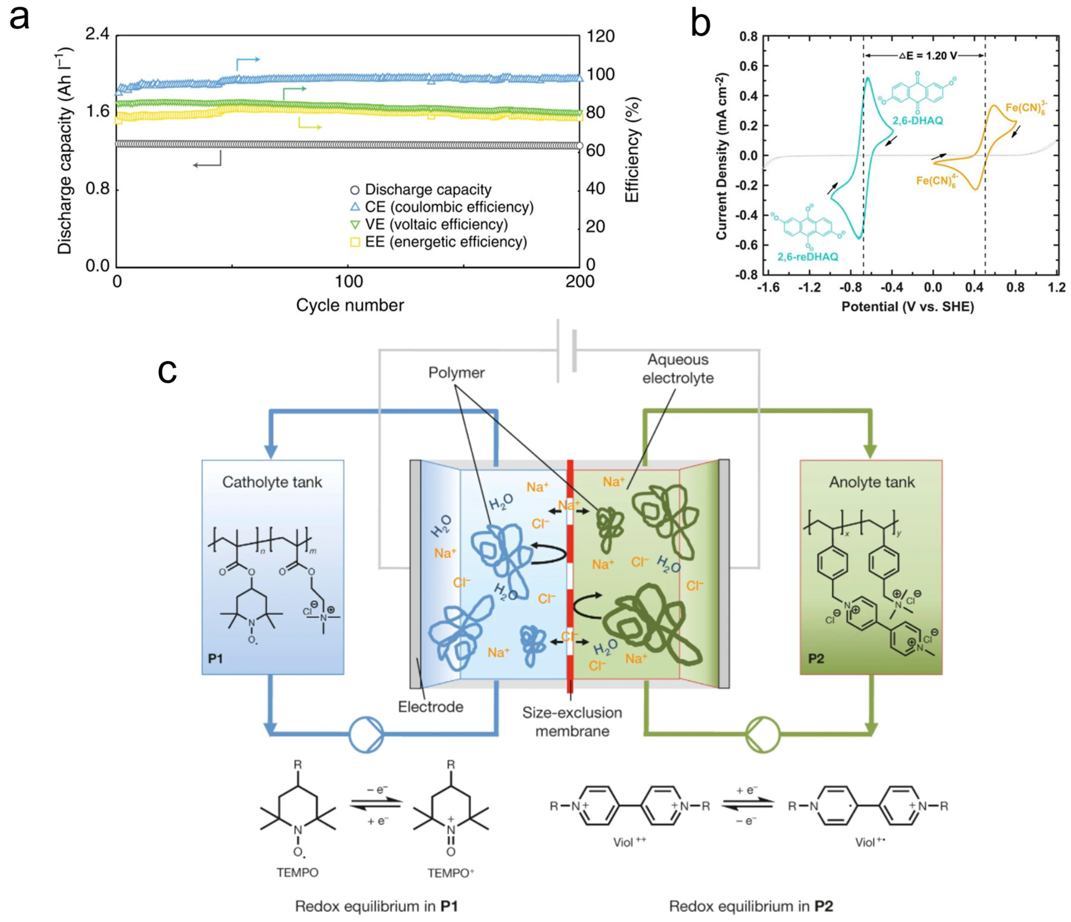 Figure 8a), showing stable cycling performance in a strong base redox-flow battery [