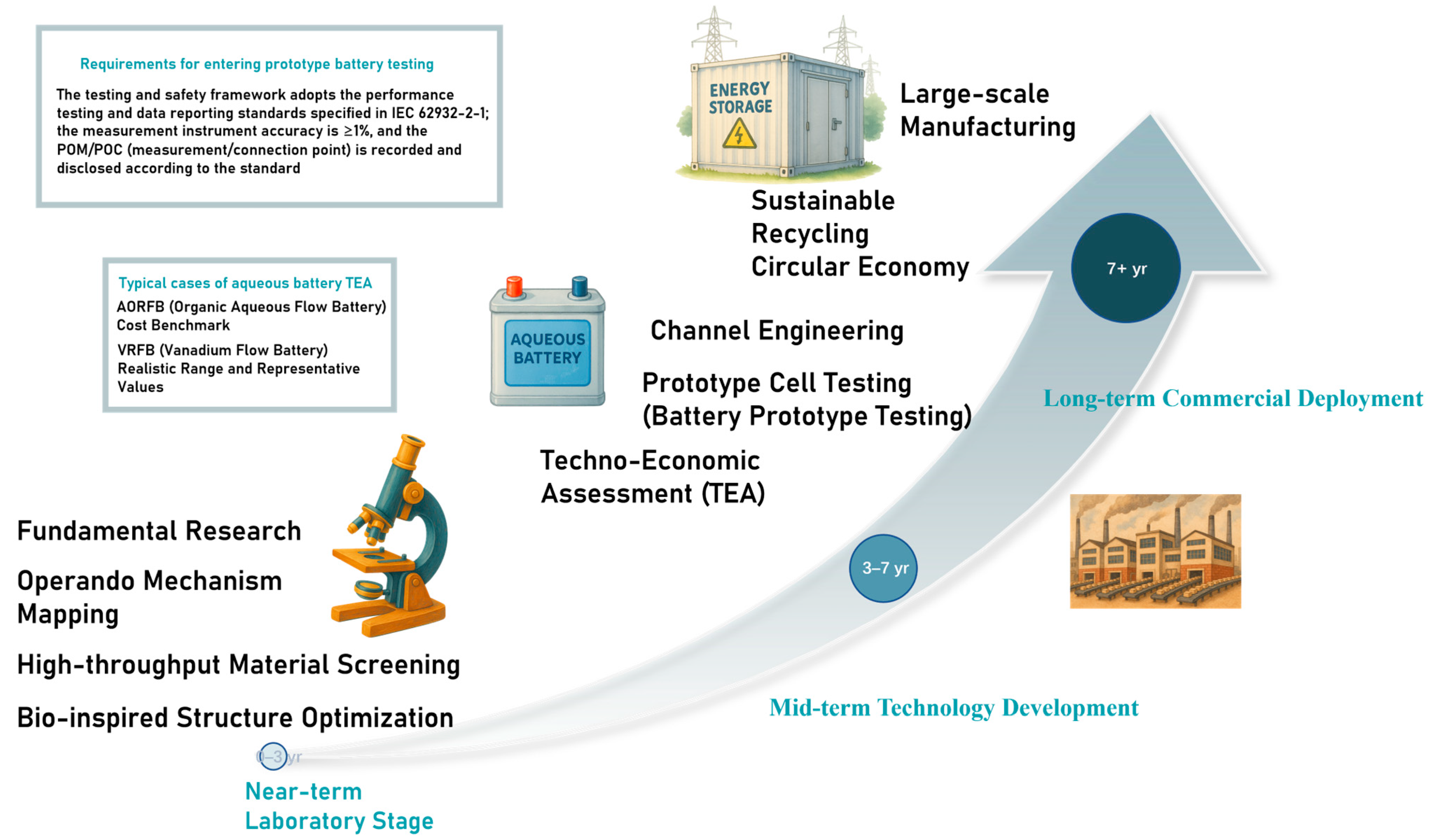 Figure 9 sketches a time-scale roadmap from laboratory discovery to commercial deployment. There are numerous TEA cases, but here are two classic examples: a cost benchmark for Aqueous Organic Flow Batteries (AORFBs) employs Monte Carlo uncertainty analysis, yielding average capital costs of approximately 674 and 398 €/kWh for 4 and 8 h, respectively. Two LCOS calibers are reported: one accounting for irreversible losses alone and one including the total cost of charging energy (e.g., 4 h, 530~663 €/MWh). The probability range for AORFBs being lower than VRFB capital costs under current conditions is quantified (approximately 16.9–29.6%) [