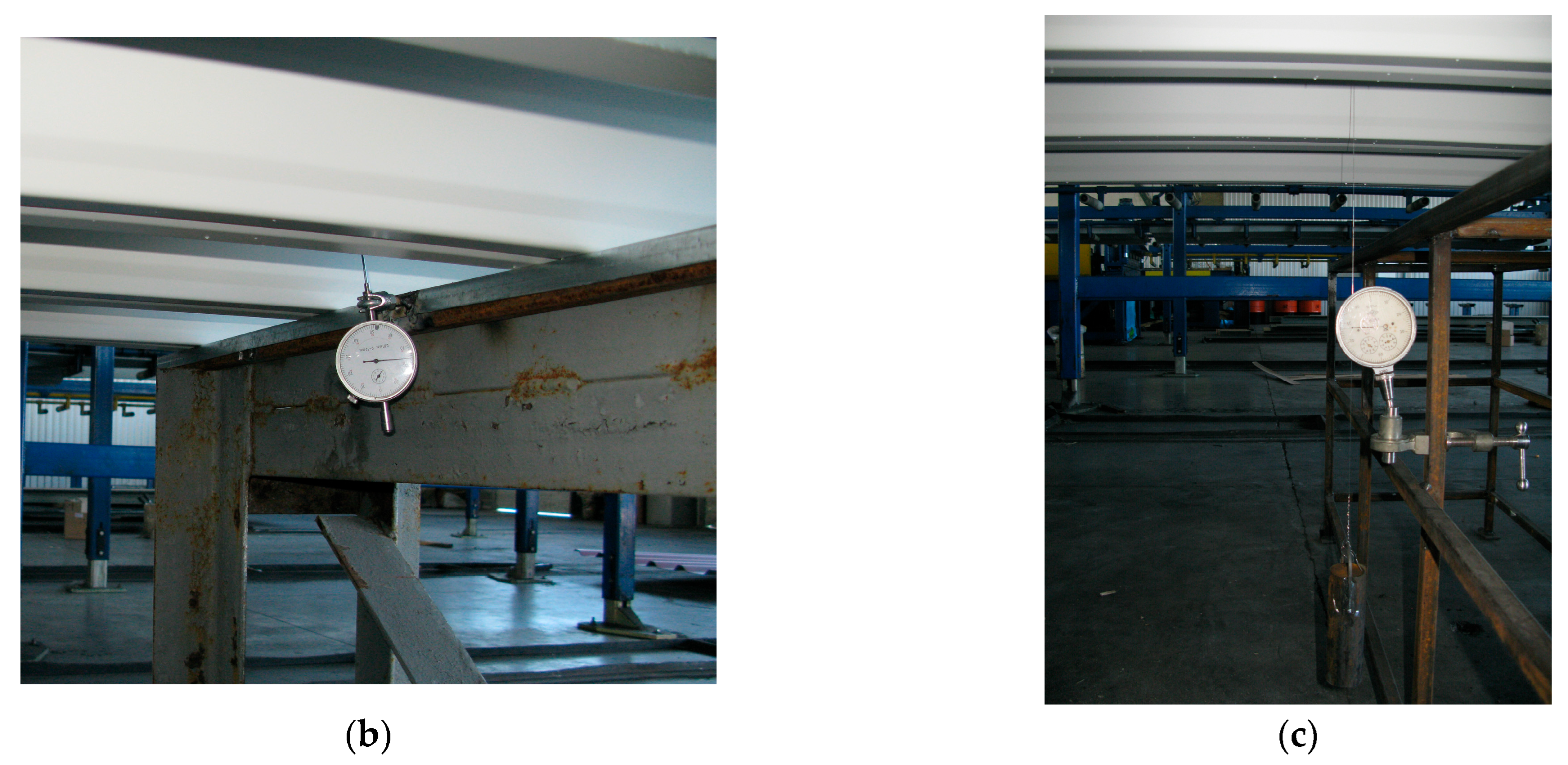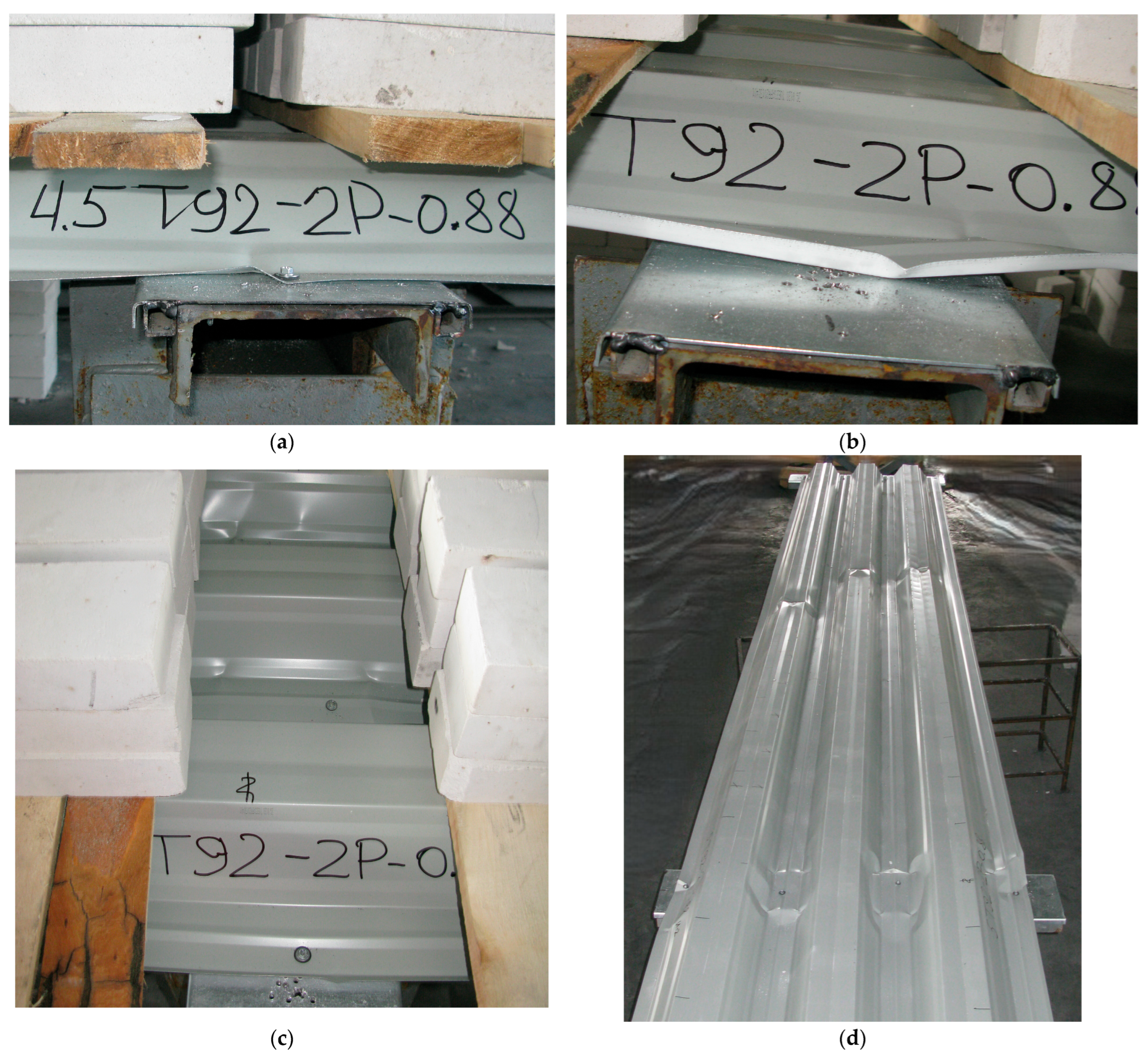 - Szumigała, T.; Rzeszut, K. Does standard test of trapezoidal sheets allow for a reliable assessment of their load-bearing capacity in real structures? In Proceedings of the XXVIII LSCE 2022: Lightweight Structures in Civil Engineering: Contemporary Problems, Poznan, Poland, 1–2 December 2022. [Google Scholar]