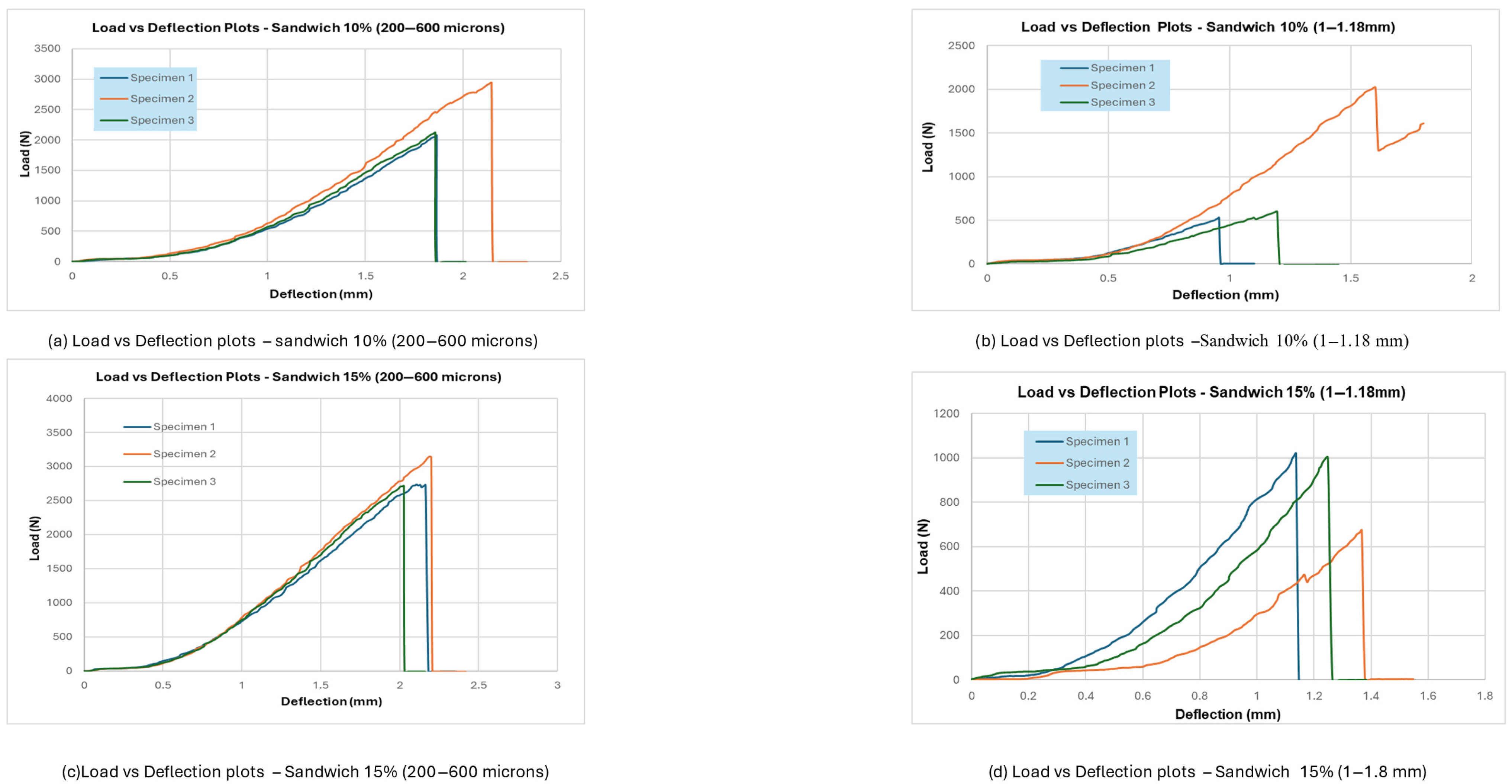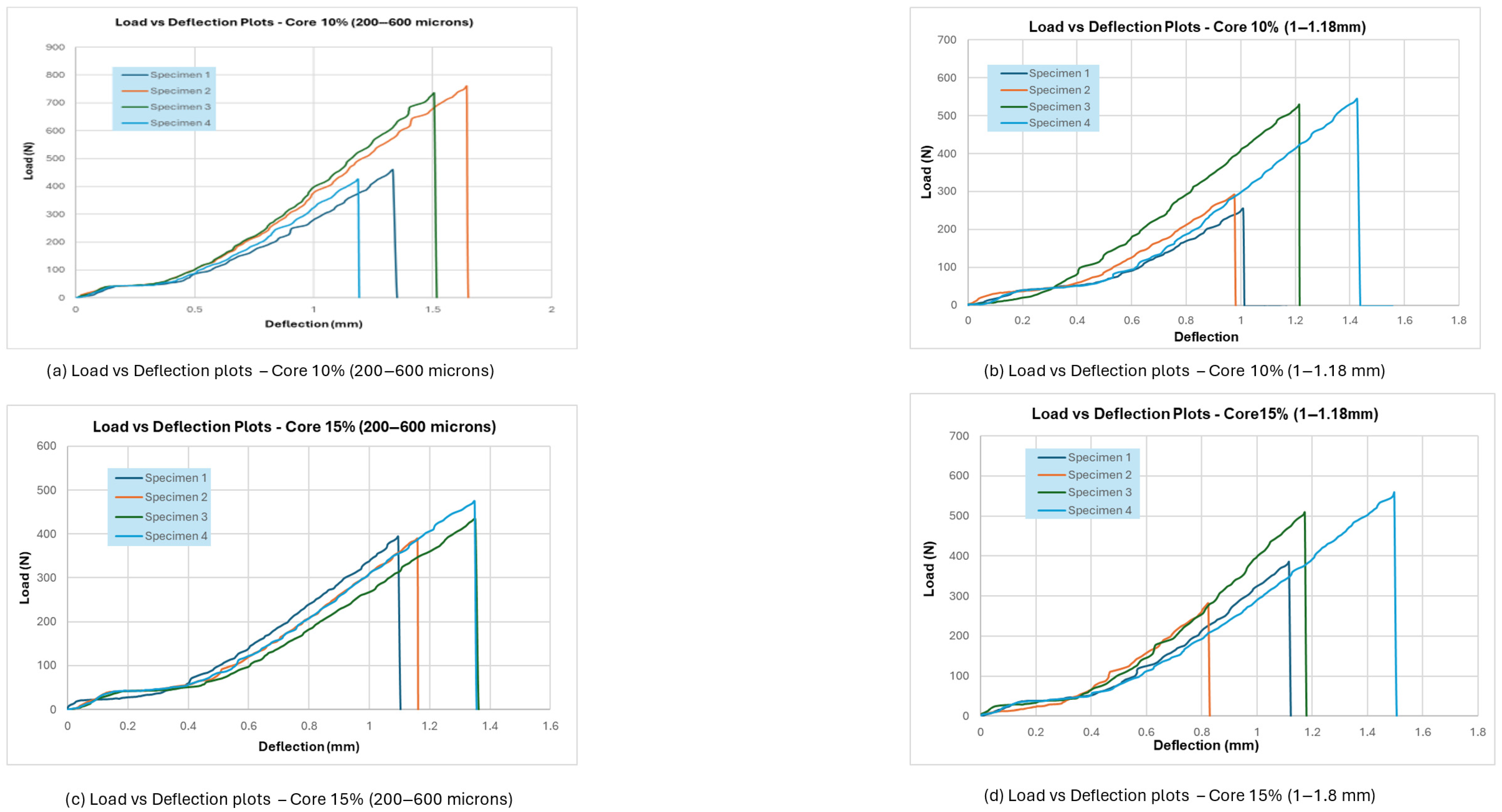 - According to the flexural data, a 15% sandwich with a size of 1–1.18 mm exhibits the maximum deflection, rendering it more flexible and resilient under stress, whereas a 15% core with a size of 200–600 µm has the lowest deflection, resulting in increased stiffness and reduced flexibility.