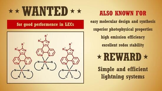- Nemati Bideh, B.; Roldán-Carmona, C.; Shahroosvand, H.; Nazeeruddin, M.K. Low-Voltage, High-Brightness and Deep-Red Light-Emitting Electrochemical Cells (LECs) Based on New Ruthenium(ii) Phenanthroimidazole Complexes. Dalton Trans. 2016, 45, 7195–7199. [Google Scholar] [CrossRef]