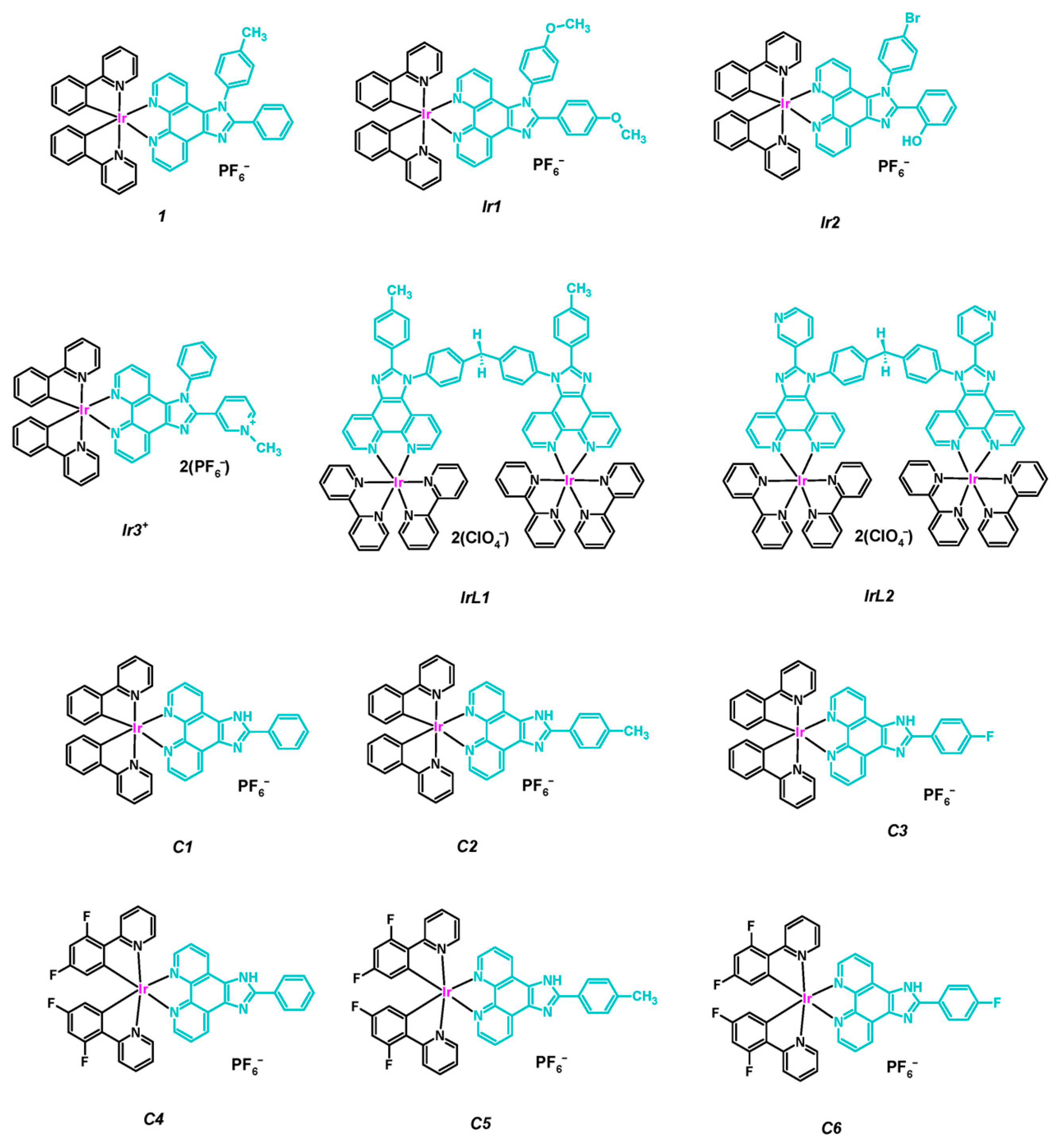 - Yang, X.-H.; Li, M.; Peng, H.; Zhang, Q.; Wu, S.-X.; Xiao, W.-Q.; Chen, X.-L.; Niu, Z.-G.; Chen, G.-Y.; Li, G.-N. Highly Luminescent Mono- and Dinuclear Cationic Iridium(III) Complexes Containing Phenanthroline-Based Ancillary Ligand. Eur. J. Inorg. Chem. 2019, 2019, 847–855. [Google Scholar] [CrossRef]