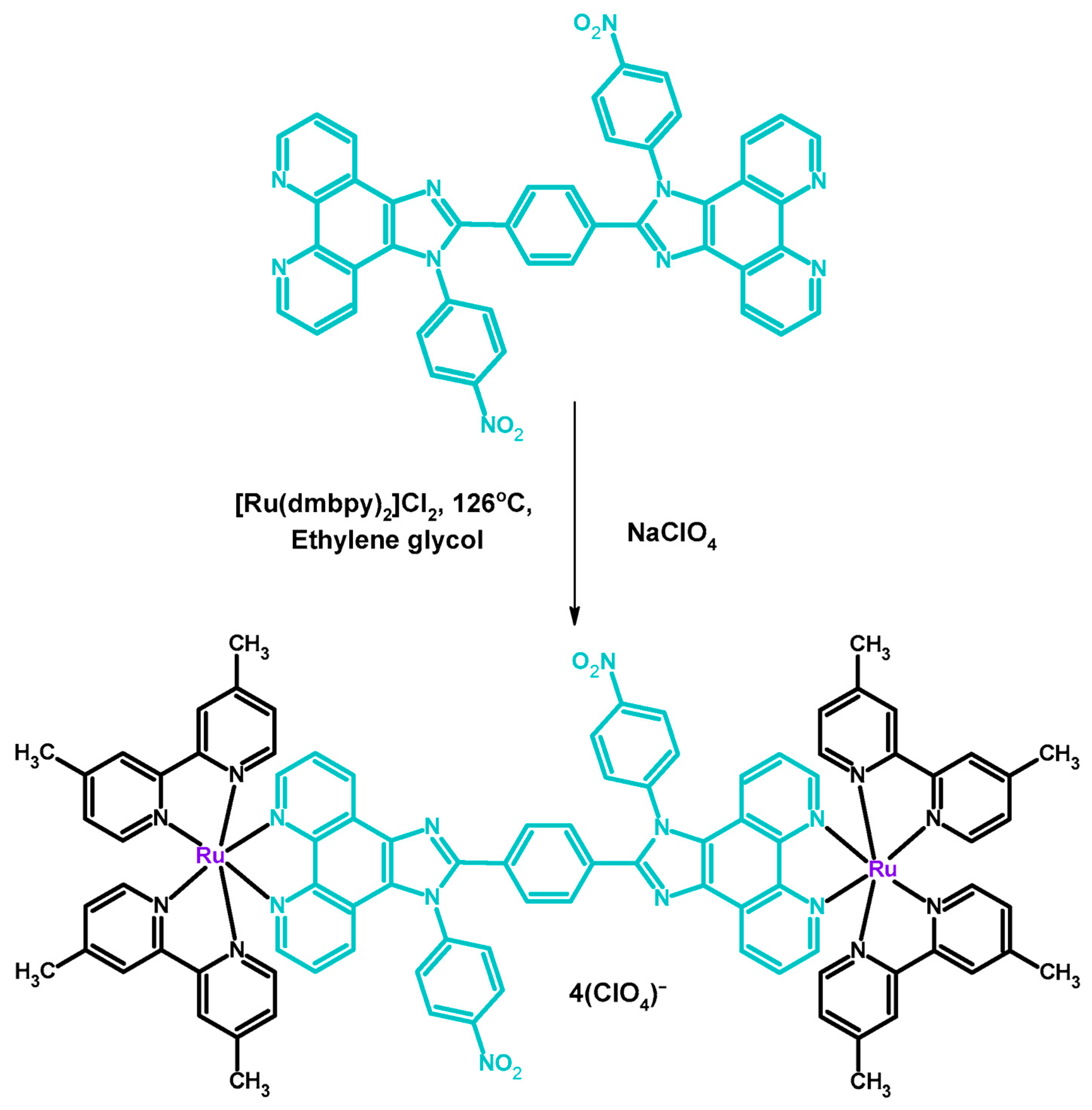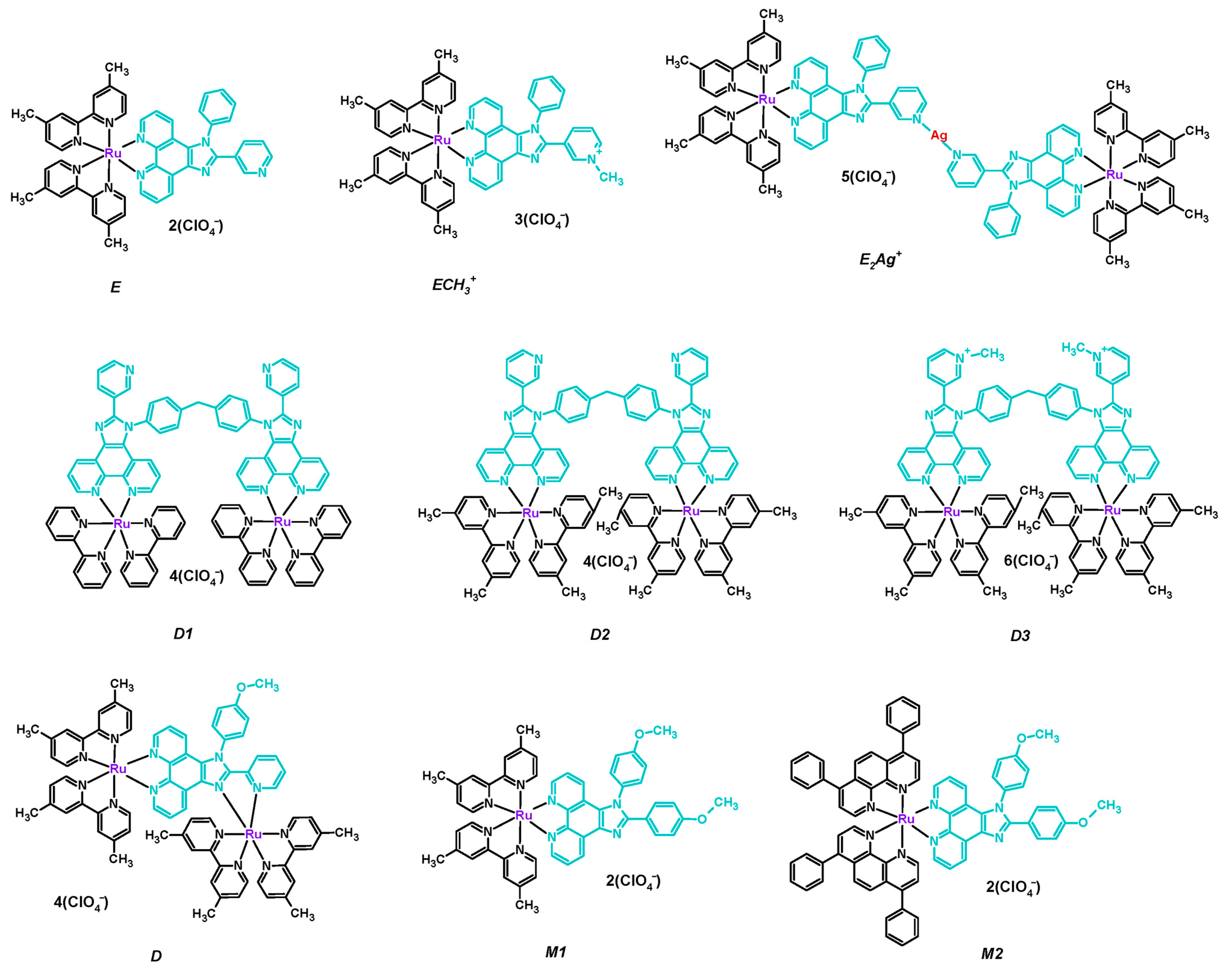 - Nemati Bideh, B.; Shahroosvand, H. New Molecularly Engineered Binuclear Ruthenium(II) Complexes for Highly Efficient near-Infrared Light-Emitting Electrochemical Cells (NIR-LECs). Dalton Trans. 2022, 51, 3652–3660. [Google Scholar] [CrossRef]