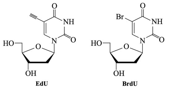 - Salic, A.; Mitchison, T.J. A chemical method for fast and sensitive detection of DNA synthesis in vivo. Proc. Natl. Acad. Sci. USA 2008, 105, 2415–2420. [Google Scholar] [CrossRef]
