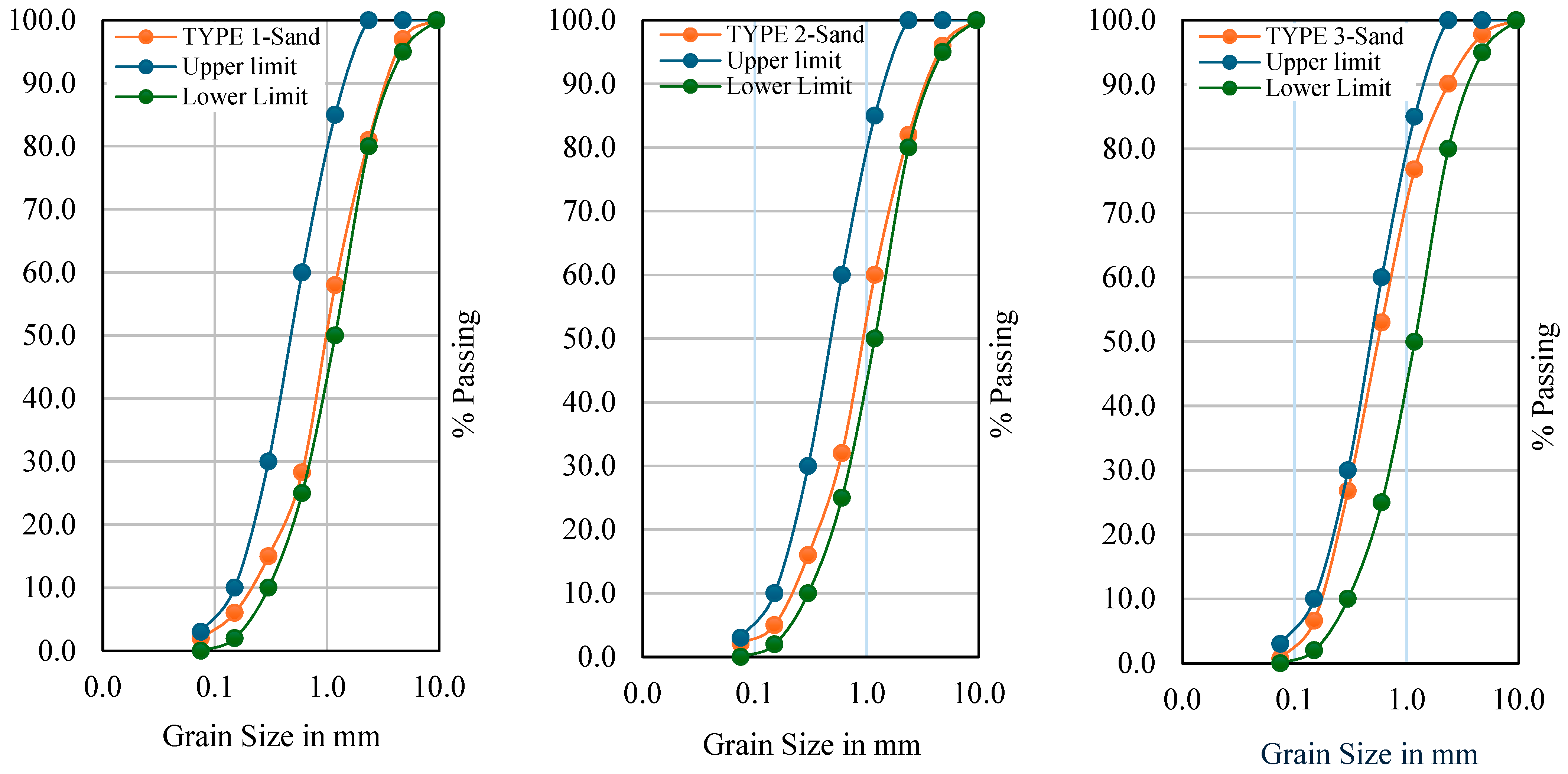 2.2.1. Gradation Curves of Prepared Sand Combinations
