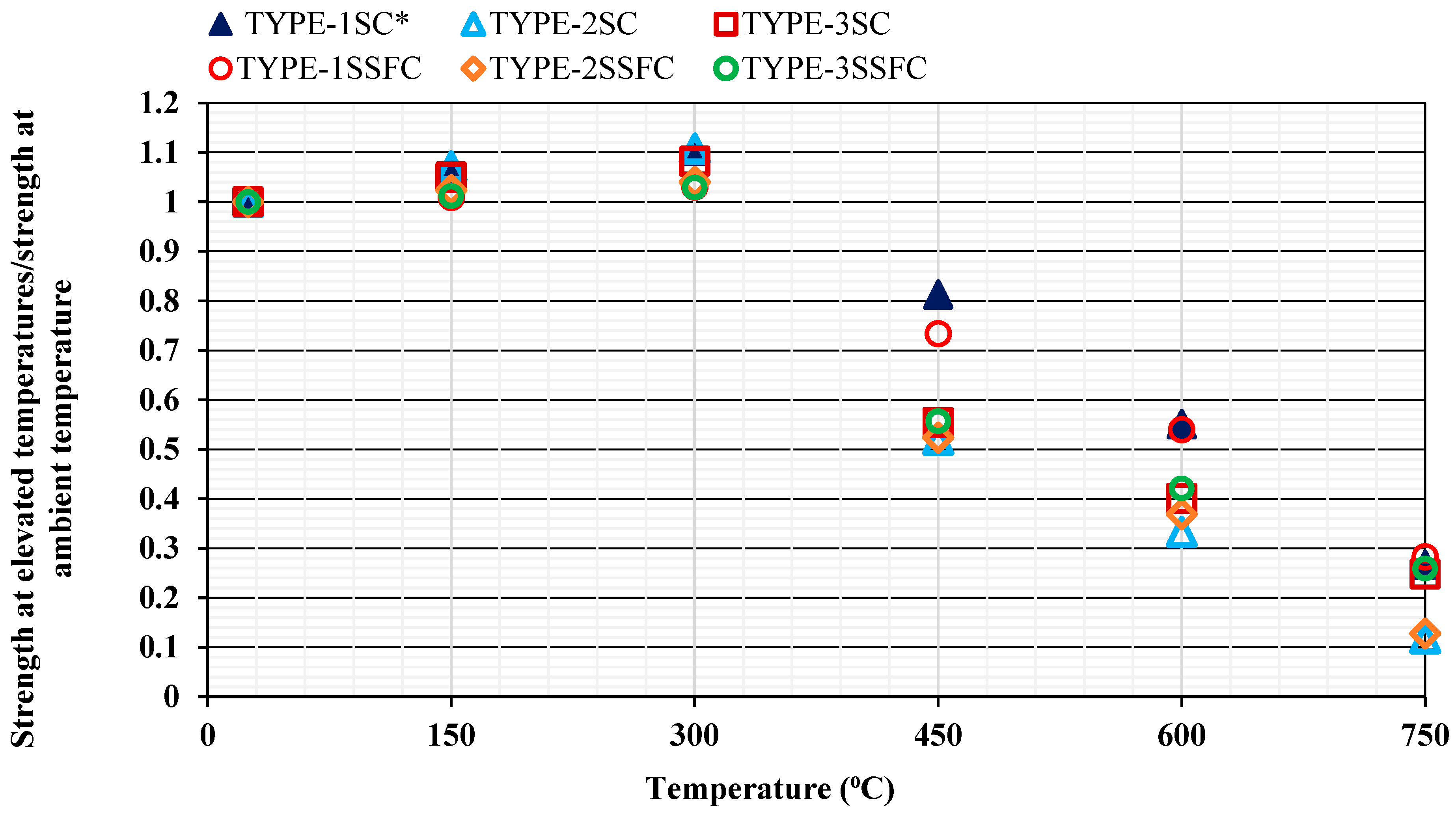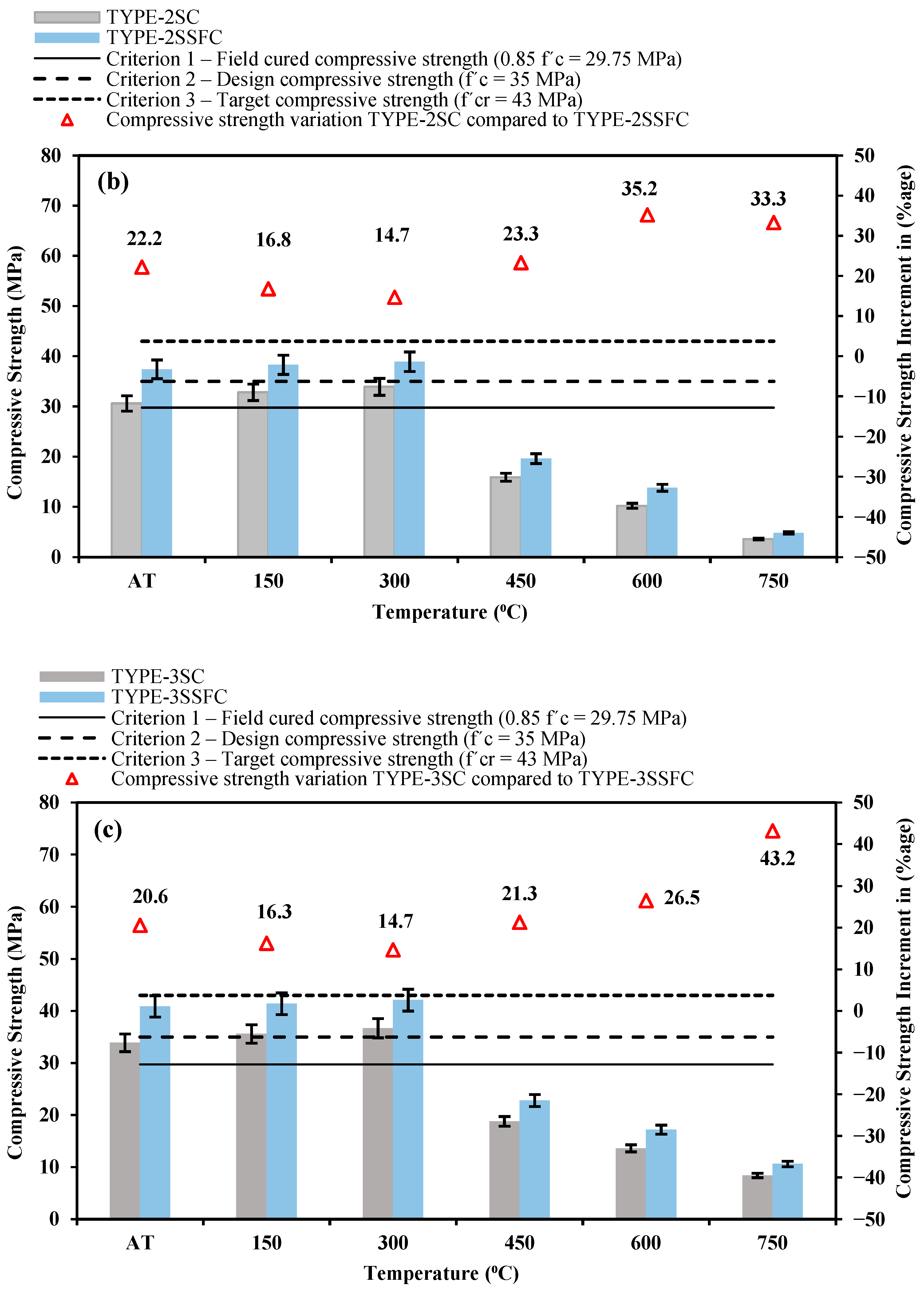 - It is concluded from the results of the study that newly developed sand concrete TYPE-1SSFC, TYPE-2SSFC, and TYPE-3SSFC with the optimized 10% silica fume showed less deterioration in the samples at each heating stage (150, 300, 450, 600, and 750 °C) compared to the mixes TYPE-1SC*, TYPE-2SC, and TYPE-3SC without silica fume content.