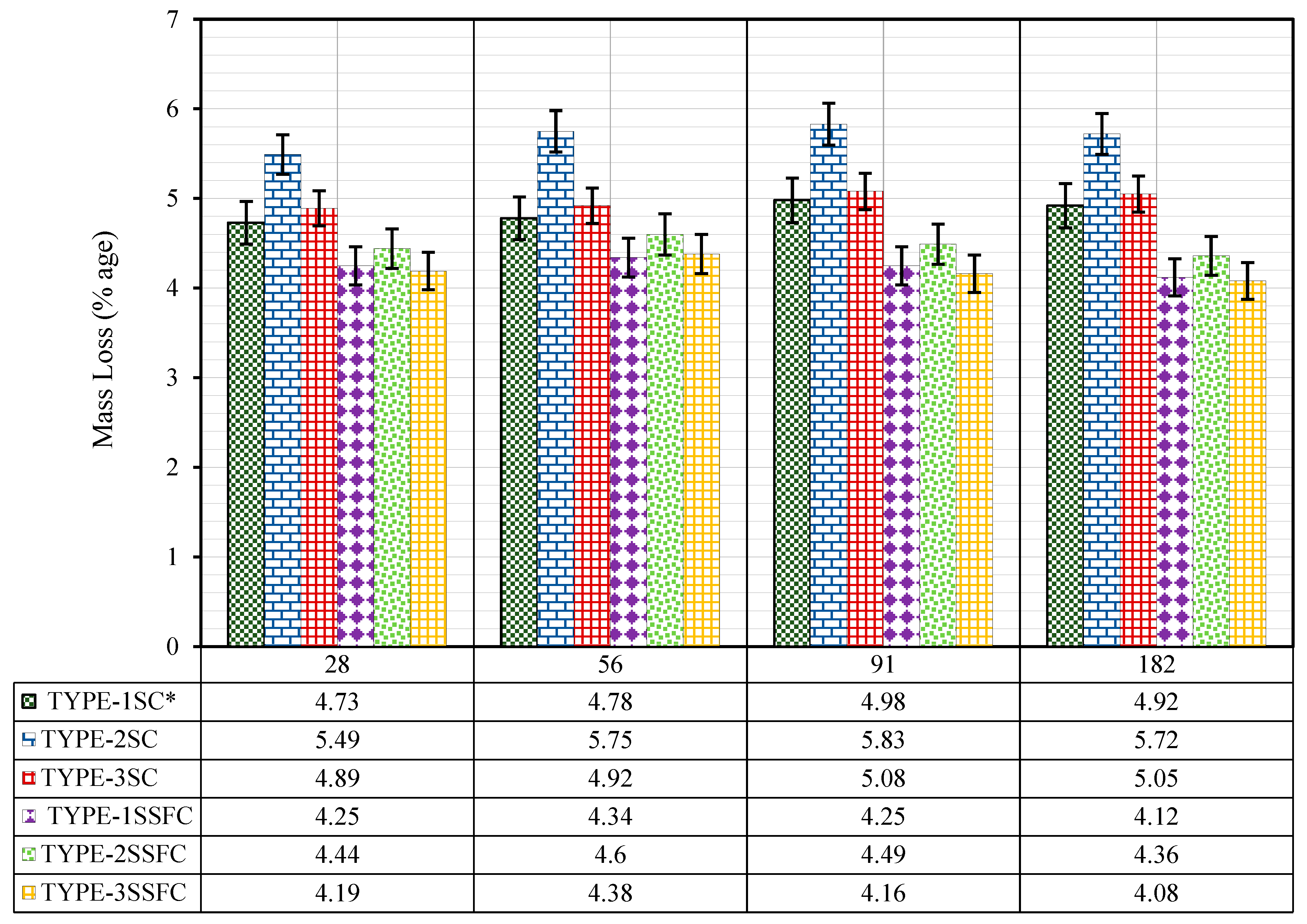 - The mass loss in the developed mix TYPE-3SSFC with 10% optimized silica fume after 28, 56, 91, and 182 days in (5% H2SO4 solution) was found (4.19, 4.38, 4.16, and 4.08) and showed better performance against the sulfuric acid solution compared to other mixes. However, the pattern of the results was the same in all mixes: the maximum deterioration of samples against a (5% H2SO4 solution) was seen within the first 28 days of immersion, and then the rate of deterioration was slowed. Secondly, the deterioration was neutralized at 182 days of immersion and did not show a noticeable reduction. Finally, it was also concluded that the mix TYPE-3SSFC with 10% silica fume has a better resistance against 5% sulfuric acid solution than the mix without silica fume.