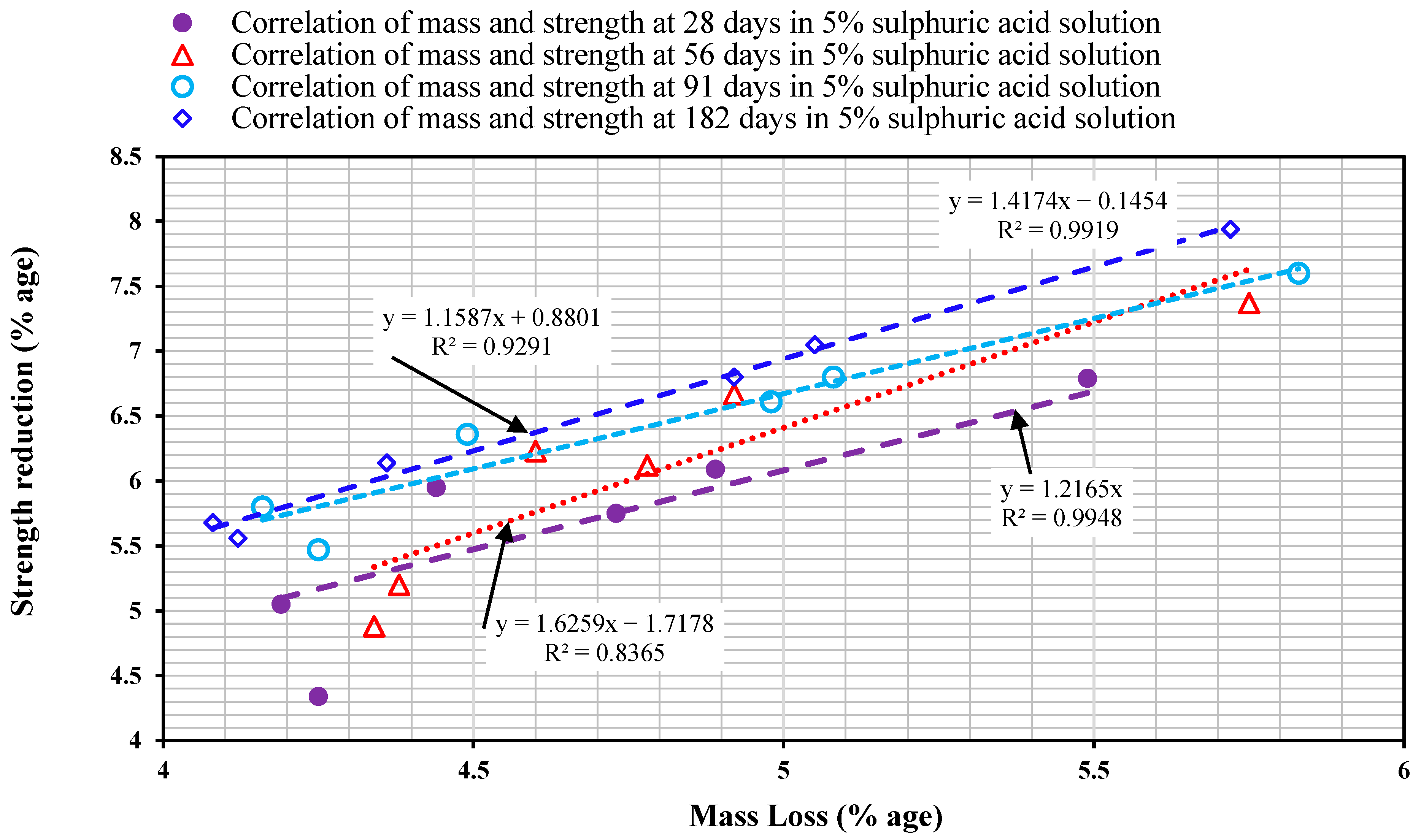 - A linear correlation coefficient between mass loss and compressive strength reduction was obtained during the immersion of samples in 5% H2SO4 solution. It can be found from the results that the value increased as the duration of the samples increased, and the highest value was reported following 182 days of immersion period: . As and when the duration was increased beyond 28 days, the variation in pH was reported, and the neutralization reaction slowed down. A slight variation in mass increment was observed at 56 and 91 days. This phenomenon would be neutralized when the immersion period reached about 182 days.