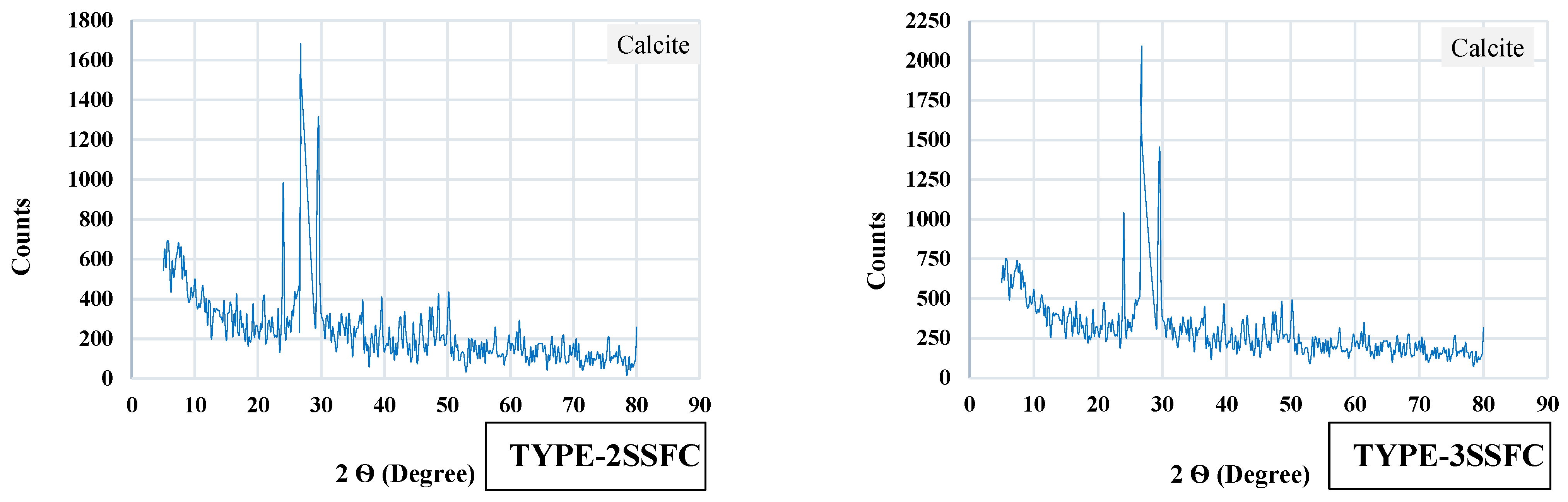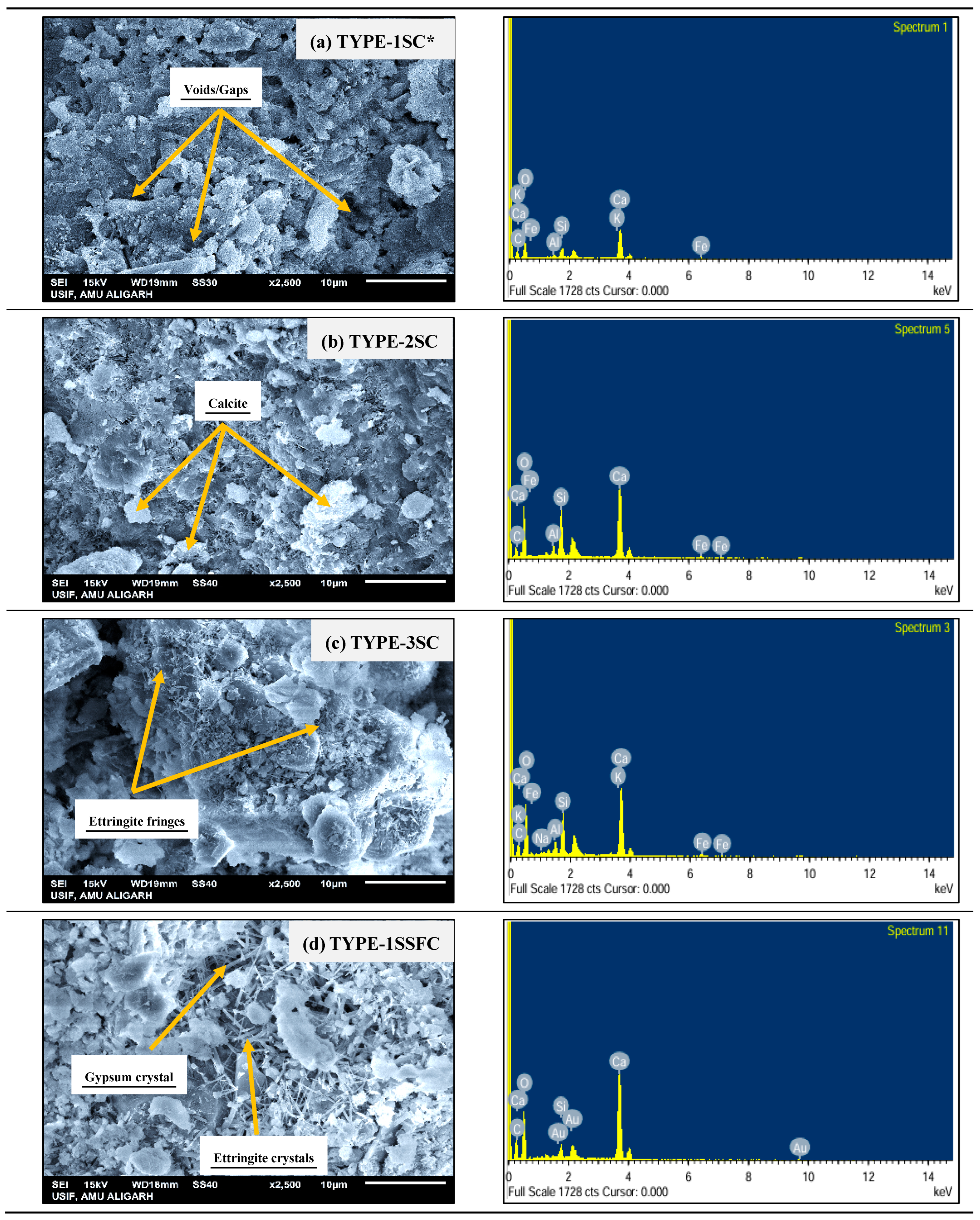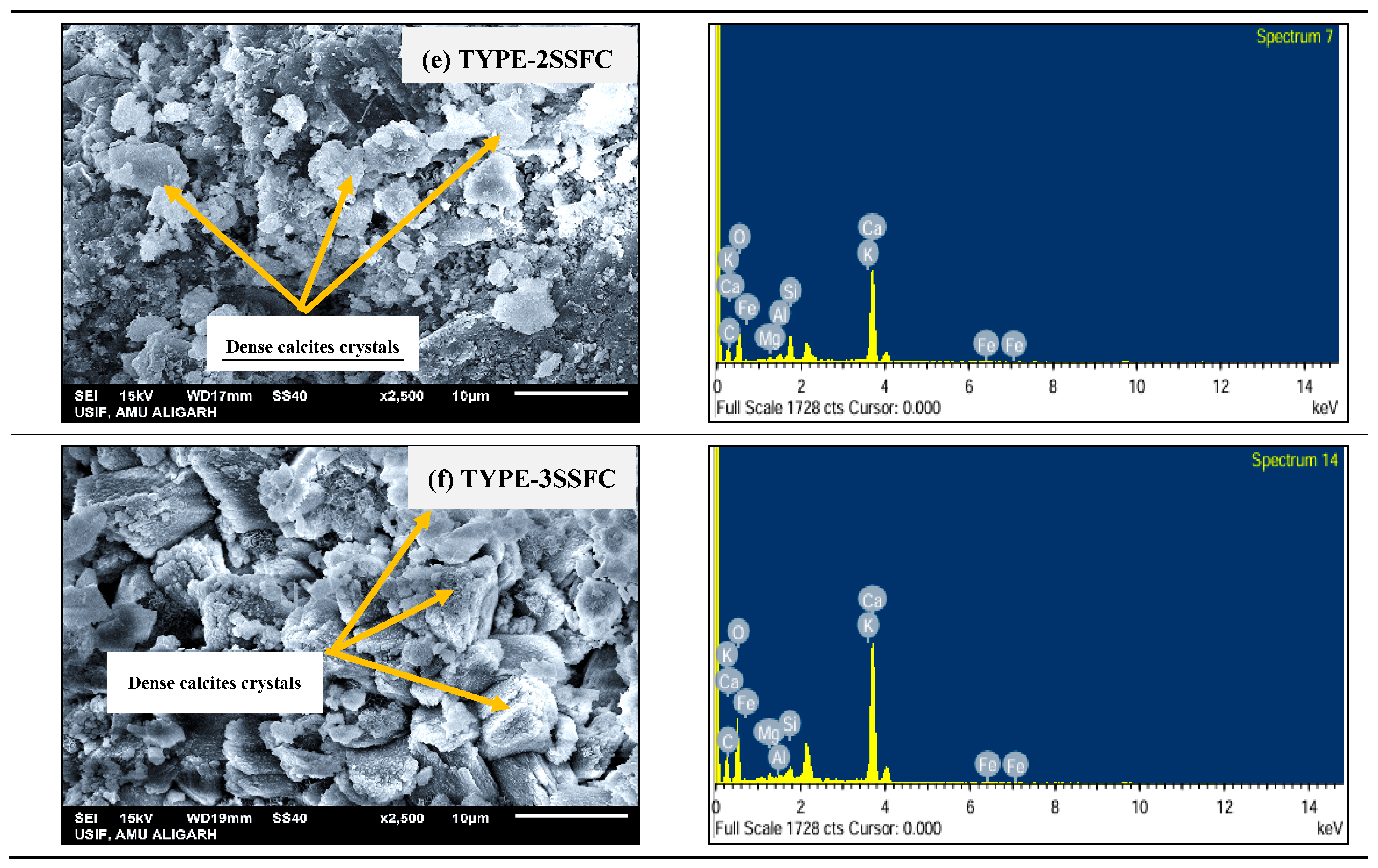 - The microstructural investigation (SEM-EDS) in the prepared concrete mix TYPE-3SSFC combination shows the establishment of CSH gel and calcite crystals, which solidify into a solid mass, creating a more compact and solid matrix. This was due to the availability of calcite precipitations in recycled sand and silica fume in the mix. Hence, it is concluded that it was crucial to stabilize the solid matrix structure, which ensured better stability against high thermal resistance and acid attacks.