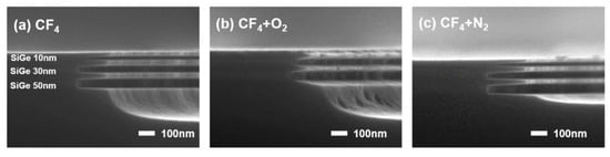 Figure 1c depicts the etching outcome with the addition of 5 sccm of N2 to 30 sccm of CF4. The lateral etch depths for Si0.75Ge0.25 layers of 50, 30, and 10 nm were deeper than those achieved with CF4 alone. From Figure 1, pure CF4 or CF4 with N2 as an additive appears to be a promising gas chemistry for the selective etching of SiGe.