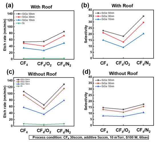 Etch rate (a,c) and SiGe/Si selectivity (b,d) under CF4 plasma with 5 sccm of O2 or N2 additive gas, measured for SiGe layers of 10, 30, and 50 nm thickness, with and without a roof structure.