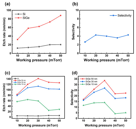 Etch rate and SiGe/Si selectivity as a function of the working pressure. (a,b) Results from the blanket Si and SiGe films with a roof. (c,d) Results from the SiGe/Si ML structures with different SiGe thicknesses (10, 30, and 50 nm) with a roof.
