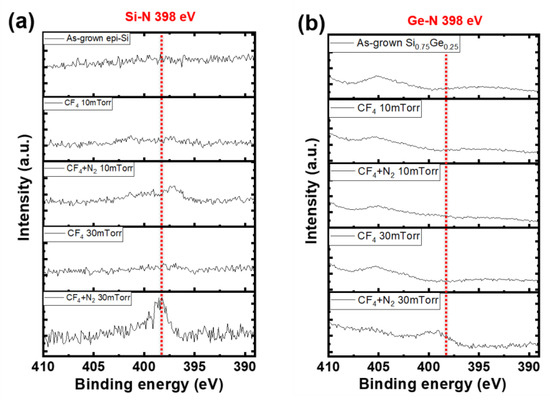 Figure 8 shows N 1s XPS spectra under varying working pressures with or without N2 addition. As shown in Figure 8b, on the SiGe surface, no distinct N-related peak was observed, or it appeared very broad. Therefore, N-passivation was selectively observed on the Si surface under the 30 mTorr condition. As a result, the formation of Si–N bonds suppressed etching on the Si surface, thereby enhancing the etching selectivity over the SiGe layer. Si–N bonds typically appear at ~398 eV in the N 1s region [21,22]. Herein, a clear Si–N peak appeared under CF4 (20 sccm) + N2 (10 sccm) plasma at 30 mTorr, confirming that N passivation occurred on the Si surface under these conditions.