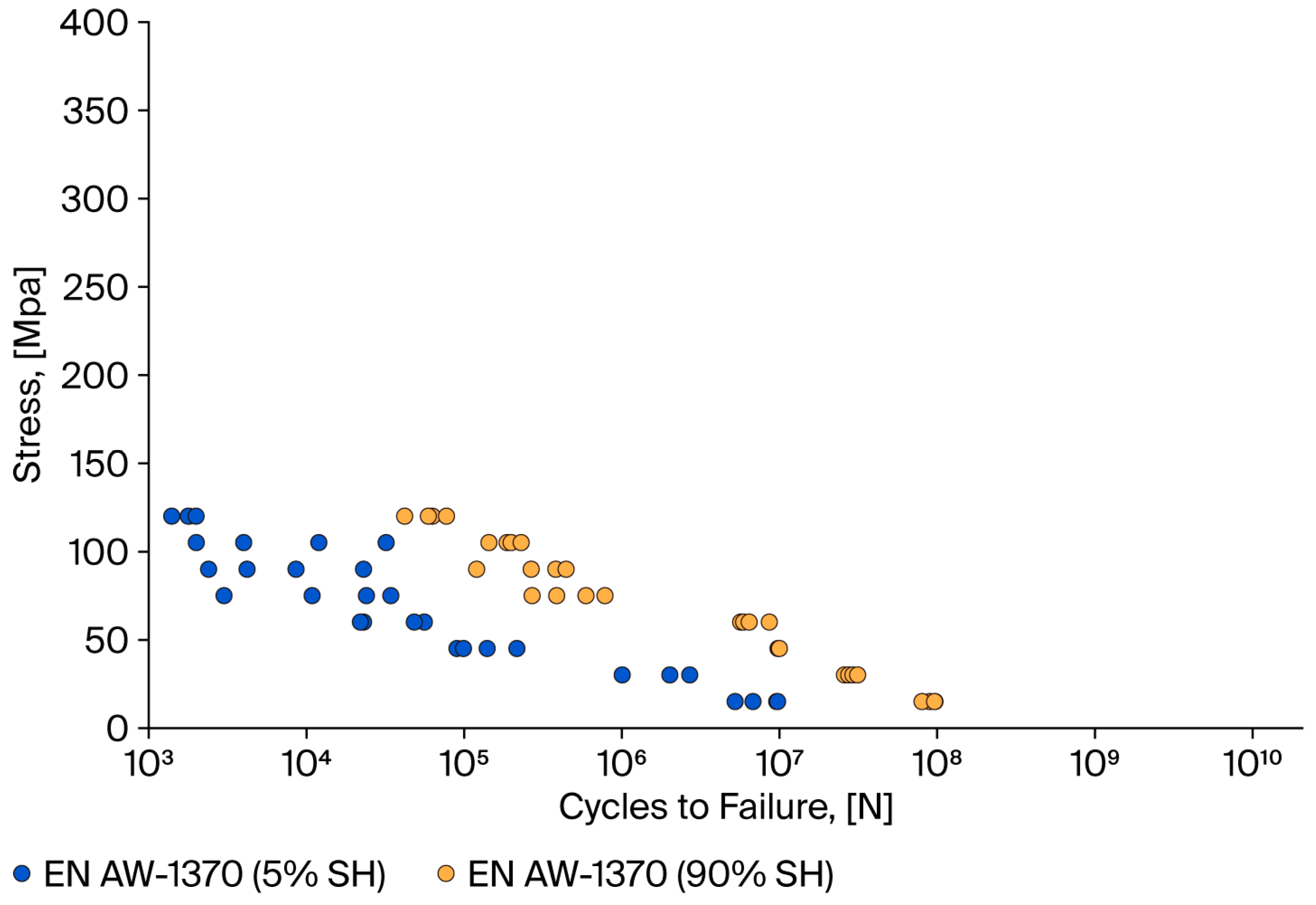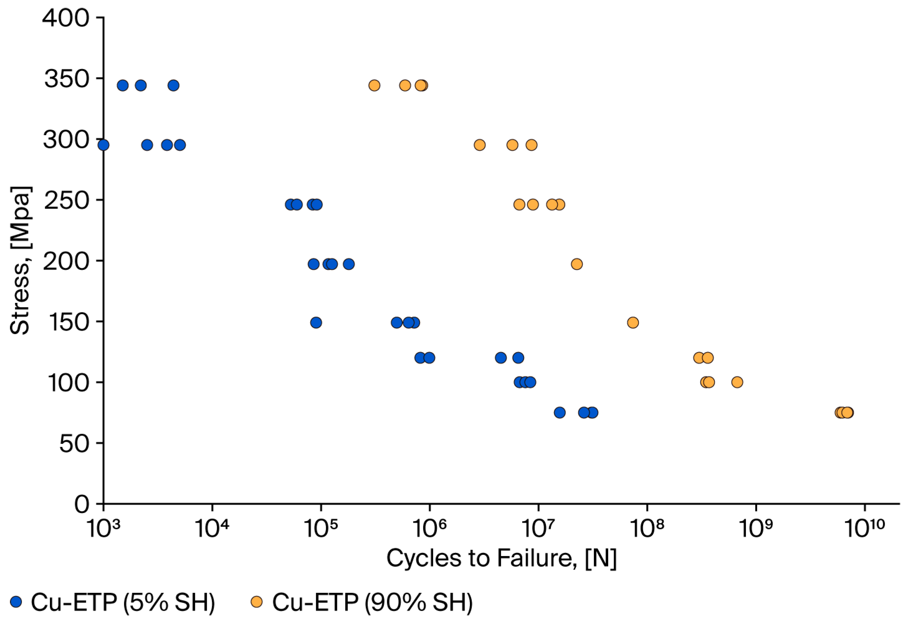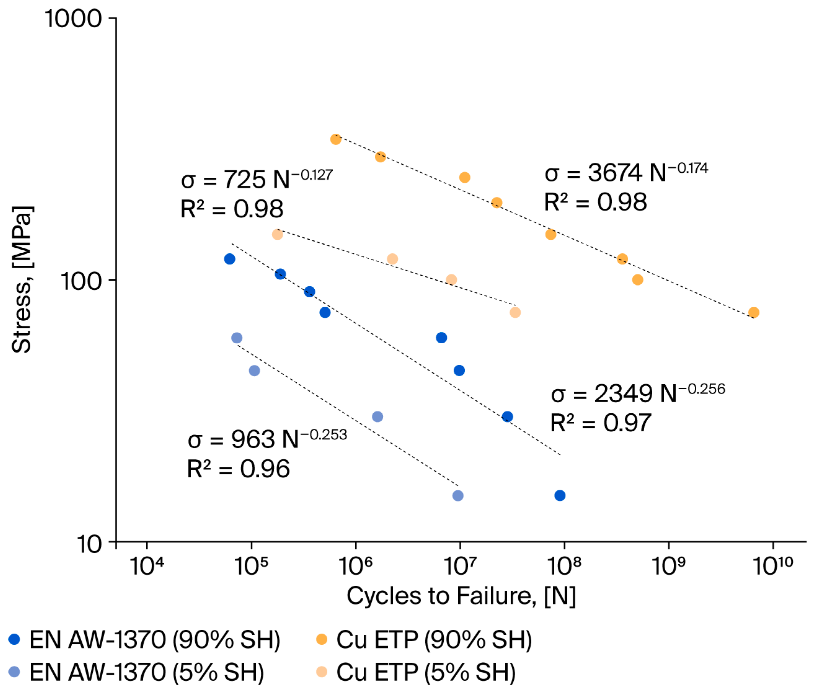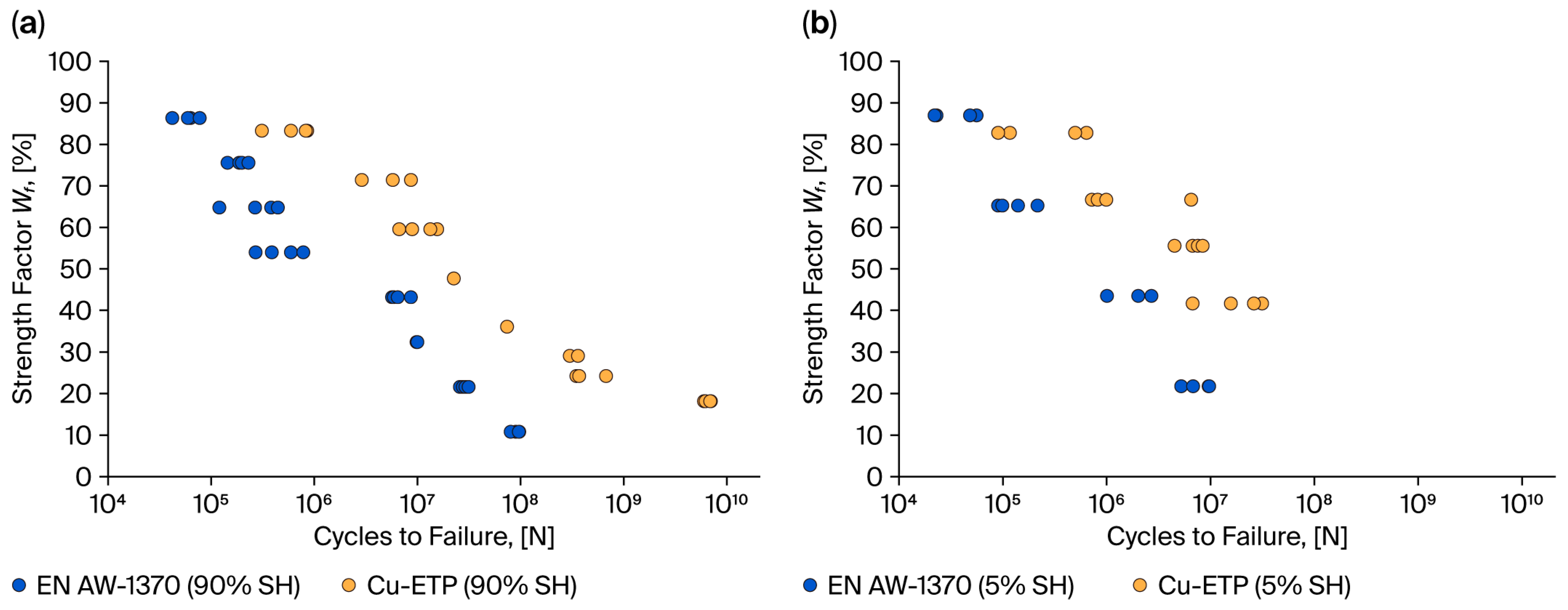 - The fatigue strength analysis encompassed the preparation of classic S-N diagrams in coordinate systems based on the bending stress amplitude and number of cycles. The Wöhler characteristics for Cu and Al intersect and differ in terms of the slope of the logσ-logN system. The curve representing aluminium wires lies slightly below the curve representing Cu-ETP wires. The fundamental distinction between these two categories is predicated on the disparity in their respective slopes, which is evidenced by the power coefficient Z, as delineated by the Wöhler equation. For aluminium wires, the Z factor is −0.253 (5% SH) and −0.256 (90% SH), while for copper wires, Z is −0.127 (5% SH) and −0.174 (90% SH). The findings of these experiments demonstrated that the absolute value of Z for aluminium wires is nearly double that of copper wires. Research has demonstrated that an elevated Z factor is indicative of accelerated degradation of the local microstructure, which, in turn, corresponds to reduced fatigue life.