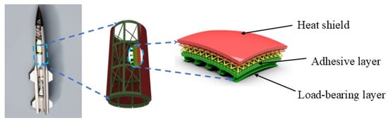 For instance, in the multi-layer thermal protection system (TPS) of an aircraft, during high-speed flight, the friction between the aircraft and the air generates high temperatures. The structural shell surface typically includes TPSs, as shown in Figure 1. These TPSs generally consist of a heat-resistant layer, an insulating layer, and a load-bearing layer. Due to the difference in the coefficient of thermal expansion between heat-resistant materials and structural materials, adhesive bonding is required. However, high-speed aircraft needs to endure a series of unique environmental conditions, so the strain capability of the adhesive bonding system must be considered.