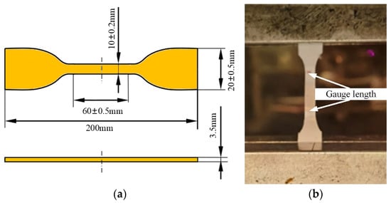 Figure 2. (a) Dimension of dumbbell-shaped specimens; (b) tensile test set-up.