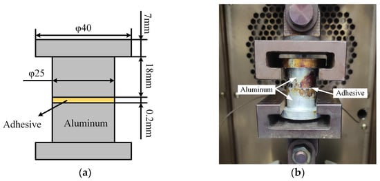 The metal butt joint tensile test obtains the quasi-static tensile strength of adhesive bonds. Orthogonal peel specimens, designed according to ASTM D897 [19], and tension tests are employed. Specimens were prepared with flat surfaces to ensure a uniform adhesive layer at the interface. The surfaces were rigorously cleaned using acetone to eliminate dust and particulate contamination, adhering to the adhesive manufacturer’s specifications. The test specimens and the assembly of specimens mounted on the testing machine are shown in Figure 3. The loading speed of the specimen is 2 mm/min. The number of test specimens is 5. Start the machine and load until the specimen is damaged. Record the maximum load at the time of failure and the type of specimen failure, including cohesive failure, adhesive failure, and metal failure.