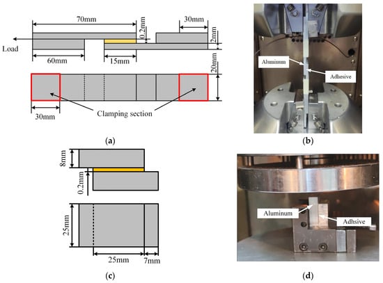 Figure 4. (a) Dimension of tensile shear specimens and; (b) tensile shear tensile test set-up; (c) Dimension of compressive shear specimens; (d) compressive shear test set-up.