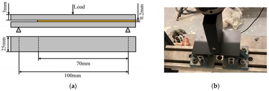In accordance with ASTM D7905 [20], the ENF specimen is used to accurately characterize the Mode II slip fracture energy during crack propagation, establishing a quantitative comparison system for normal/tangential energy dissipation. The number of test specimens is 5. The test specimens and the assembly of specimens mounted on the testing machine are shown in Figure 6. The loading speed of the specimen is 2 mm/min. The ENF test is employed to determine the tangential fracture energy GIIC of adhesives and investigate their failure modes under tangential loads, with the tangential fracture energy calculated as: