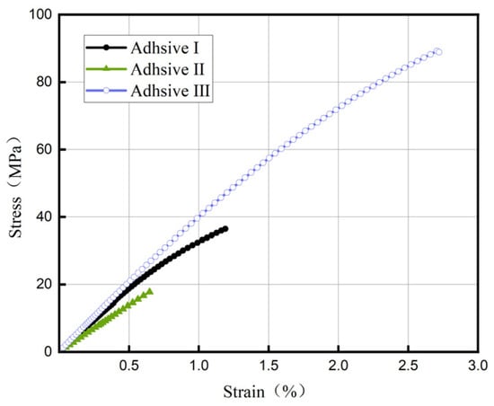 Figure 7. Tensile stress–strain curves of three adhesives.