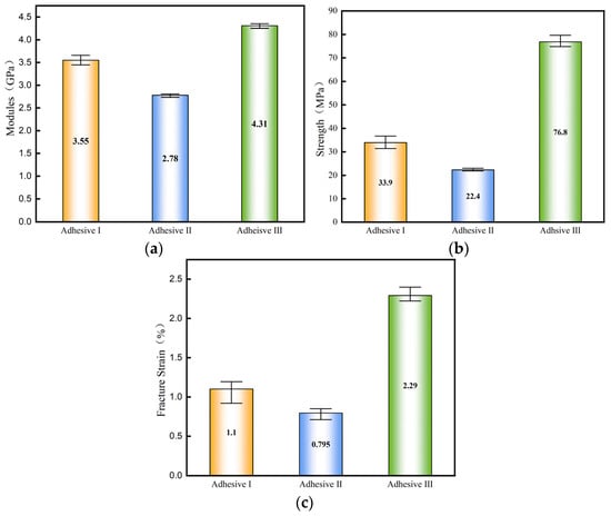 Figure 8. Comparison of parameters in bulk tensile tests of adhesives: (a) modulus, (b) fracture strength, (c) fracture strain.