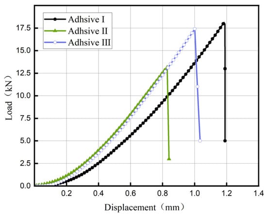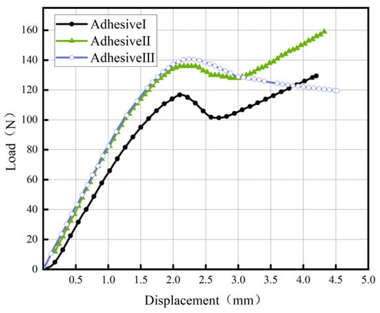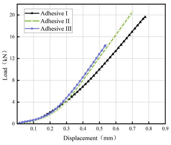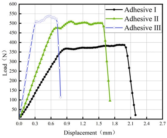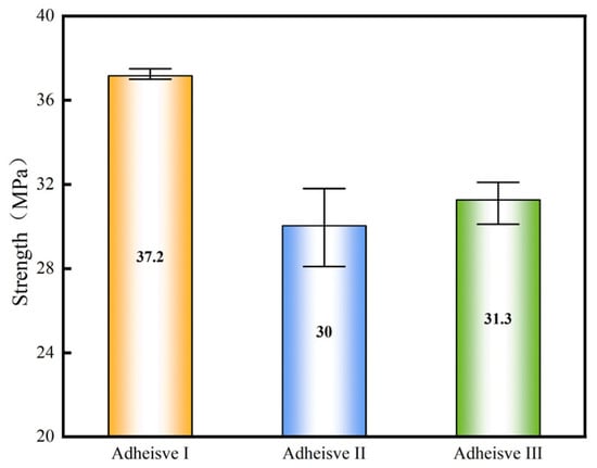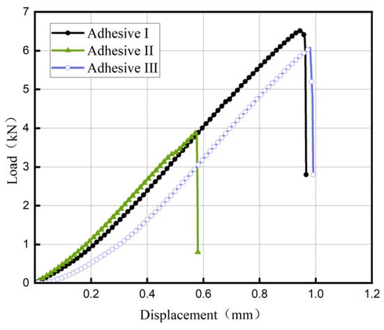 Figure 9 displays load–displacement curves for the three adhesives. In the initial linear phase, load increases proportionally with displacement; at a critical displacement, the load drops abruptly to zero, indicating brittle fracture of the adhesive layer. Adhesive I exhibits the highest butt joint tensile strength at 37.2 MPa, followed by Adhesive III at 31.3 MPa, slightly higher than Adhesive II at 30.0 MPa (Figure 10, n = 5, CV < 7%).