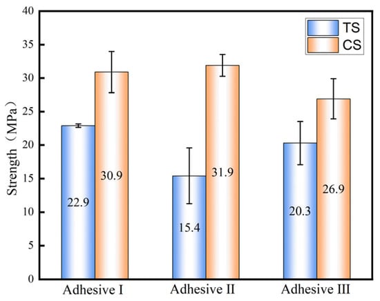 Figure 11 and Figure 12 show load–displacement curves for tensile shear and compressive shear tests, respectively. All three adhesives exhibit brittle behavior under shear loading, with a short damage evolution phase. Figure 13 compares tensile shear (TS) and compressive shear (CS) strengths. Compressive shear strengths consistently exceed tensile shear strengths, likely due to reduced stress concentration during compressive shear loading. Adhesive III’s tensile shear strength is 20.3 MPa, comparable to Adhesive I (22.9 MPa) and 32% higher than Adhesive II (15.4 MPa) (n = 5, CV < 9%).