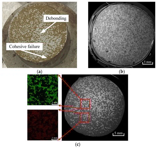 To conduct an in-depth study on the mixed failure mode under normal loads, we used a scanning electron microscope (SEM) manufactured by TESCAN (Brno, Czech Republic) with the model MIRA4 to observe the fracture surfaces of specimens exhibiting this mixed failure mode at a magnification of 10× and obtained their microscopic morphologies (Figure 18b). In this figure, the protruding parts are the adhesive that remained attached to the specimens after cohesive failure occurred. Energy dispersive spectroscopy (EDS) analysis was performed using an EDS detector produced by Oxford Instruments (Oxford, UK), and component distribution maps were obtained (Figure 18c). Among them, the green areas represent aluminum element, corresponding to the regions of debonding failure; the red areas represent carbon element, corresponding to the regions of cohesive failure. The component distribution maps derived from the SEM images were subjected to grayscale processing via an image processing program, where cohesive failure areas were converted to black and adhesive failure areas to white. Subsequently, image processing software ImageJ (1.54k) was used to identify the pixel points of the black areas and calculate their area. The results indicate that cohesive failure accounts for 69.32%, while adhesive failure accounts for 30.68%.