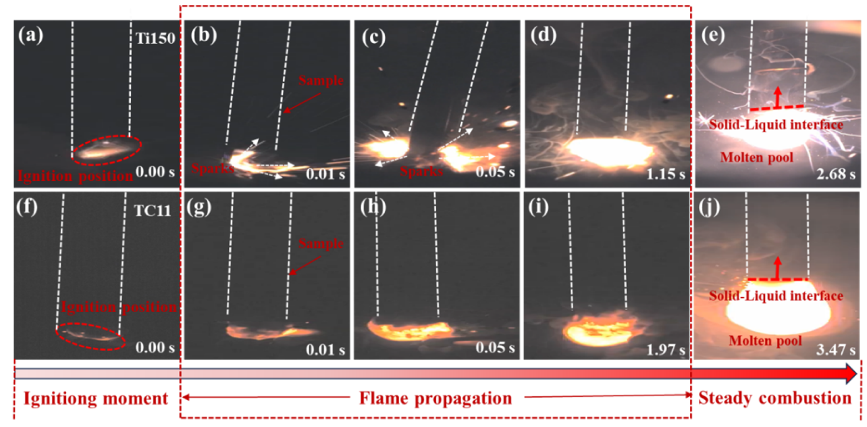- Wang, C.; Li, J.; Li, Y.; He, G.; Huang, J.; Zhang, C. Ignition and flame propagation behaviors of titanium alloys in oxygen-enriched atmospheres. J. Mater. Res. Technol. 2025, 34, 35–47. [Google Scholar] [CrossRef]