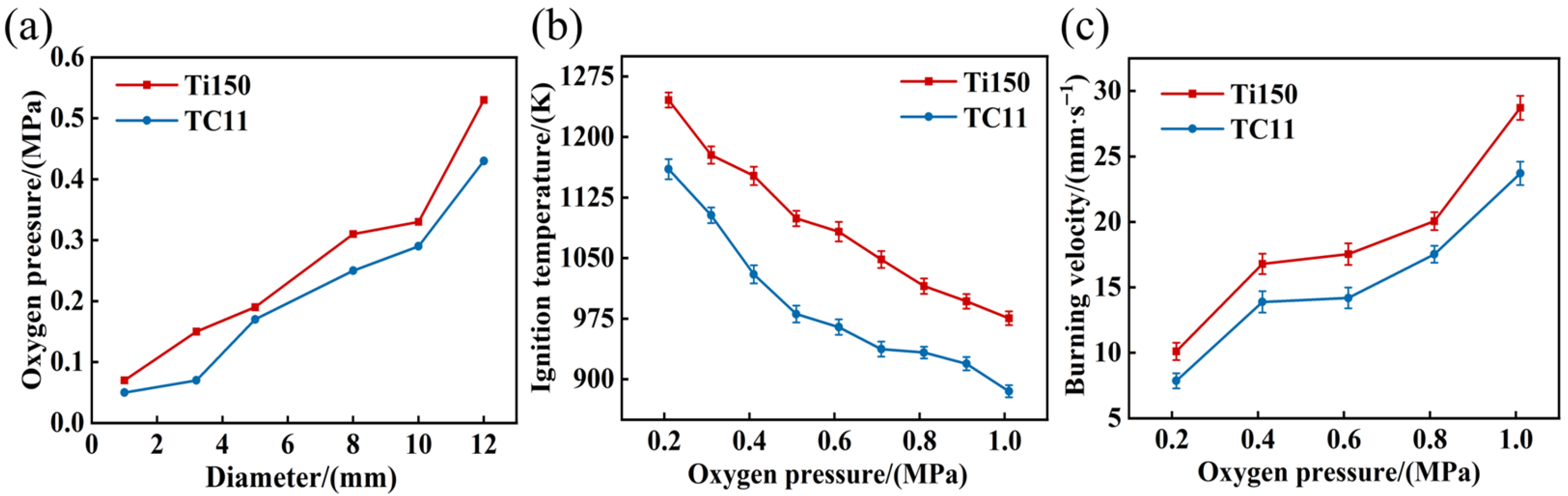 - The ignition phenomenon of the Ti150 alloy is analogous to that of typical titanium alloys. The critical ignition pressure and ignition temperature of Ti150 are both higher than those of the TC11 alloy. As the oxygen pressure increases, the burning velocity of the Ti150 alloy gradually increases. At the same oxygen pressure, the burning velocity of the Ti150 alloy is higher than that of the TC11 alloy.