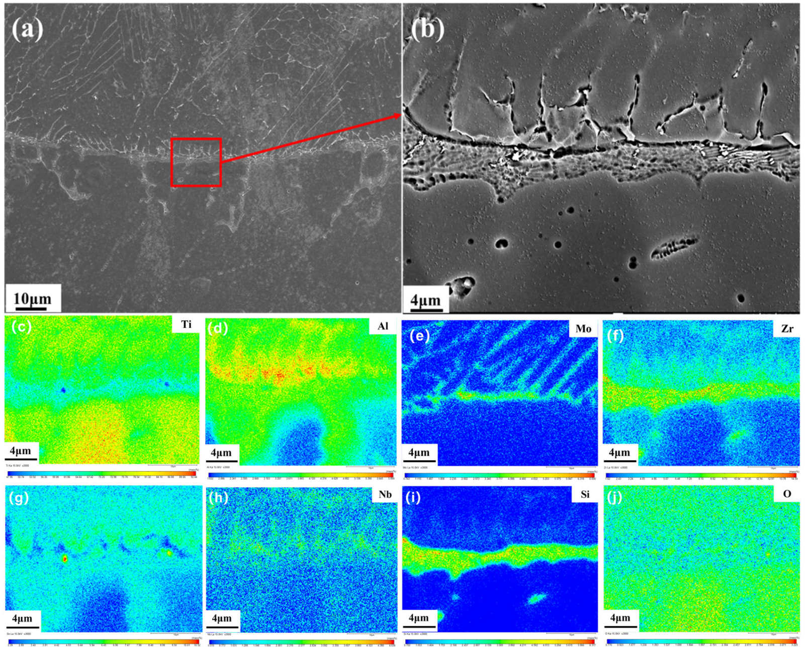- The Ti150 alloy exhibits significant differences from TC11 in terms of both the characteristics of its melting zone and the elemental enrichment at its solid–liquid interface. The melting zone of Ti150 is considerably wider (100–150 μm). Furthermore, at the solid–liquid interface, marked Zr enrichment is observed.