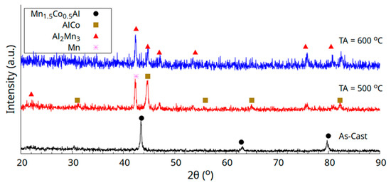 X-ray diffraction patterns for the as-cast and thermally annealed (TA) samples are given in Figure 1. From the data, we can see that the as-cast sample crystallizes into a cubic structure (just a few peaks are present); however it is disordered (there are no superstructure peaks below 40°), and this will be discussed in further detail later. In an attempt to decrease the atomic antisite disorder in the samples, thermal treatment was carried out at 500 °C and 600 °C. Nevertheless, the diffraction patterns clearly show that annealing reduced the stability of the Heusler phase and caused it to break down into a combination of the AlCo, Mn, and Al2Mn3 phases. The Al2Mn3 phase crystallizes in a cubic structure with space group P4132 (no. 213) and a lattice parameter of a = 6.411 Å, ICDD PDF 00-029-0021 [20]. The AlCo phase adopts a simple cubic structure with space group Pm-3m (221) and a lattice constant of a = 2.862 Å, ICDD PDF 00-048-1568, while the Mn phase is tetragonal, with space group I4/mmm and lattice parameters a = 2.67 Å and c = 3.55 Å ICDD PDF 00-017-0910.