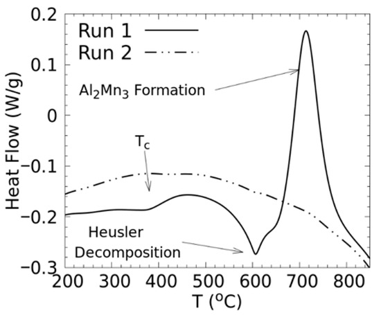 The decomposition of the Co0.5Mn1.5Al Heusler phase is also evidenced in the DSC curves (Figure 2). The first run shows a large endothermic peak around 600 °C, which corresponds to the decomposition of the Heusler alloy, and a very large exothermic peak centred around 720 °C which corresponds to the formation of the Al2Mn3 phase [21]. A small endothermic dip occurs at 400 °C, which corresponds to the magnetic transition, or Curie temperature, of the Heusler alloy. The second run for the Co0.5Mn1.5Al alloy shows no endothermic or exothermic features, which means that the phase mixtures seen in the XRD patterns are stable.