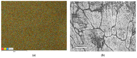 An EDS map at a scale of 5 µm (a) and an optical microscopy image at a scale of 100 µm (b) for the Co0.5Mn1.5Al alloy.