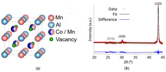 The ideal half-Heusler Co0.5Mn1.5Al crystallizes in the C1b structure (space group nr. 216). The C1b structure of the Co0.5Mn1.5Al Heusler alloy, shown in Figure 4a, is formed by three interweaved fcc sublattices with 4a sites occupied by Al, 4b sites occupied by Mn, and 4c sites occupied by Co and Mn, according to previous studies [12,22]. The 4d sites are considered vacant in the C1b structure [3,4]. The mentioned atomic occupation is in accordance with the one corresponding to the so-called -phase defined first by Harang [23] for Heusler alloys.