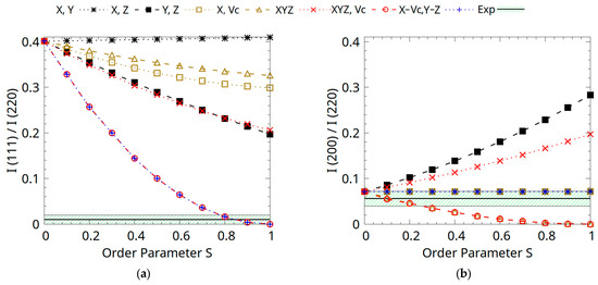 Given that the intensity of diffraction peaks is directly proportional to the square modulus of the structure factor, this method aims to qualitatively determine the most likely case of ordering by comparing the theoretical and experimental results. To make the experimental and theoretical structure factors directly comparable, excluding the influence of any additional factors, we derived the relative intensities of order-dependent reflections by normalizing all values to the (220) peak intensity. Finally, we represented the evolution of the (111) and (200) relative intensities with the increase in the S ordering parameter in Figure 5. These experimentally determined intensity values were also normalized relative to the (220) reflection, unaffected by atomic disorder Equation (4).