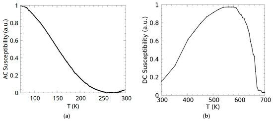 AC susceptibility and magnetization (DC susceptibility) as a function of temperature for the Co0.5Mn1.5Al sample are given in Figure 6. The sample exhibits characteristic ferrimagnetic properties, showing the asymptotic decrease in susceptibility near the compensation region of the magnetization. The thermomagnetic curves suggest an N-type ferrimagnetic behaviour of the Co0.5Mn1.5Al compound with the compensation temperature of approximately 260 K (Figure 6a), meaning that in this alloy, the magnetic moments corresponding to one sublattice compensate for the magnetic moments of the other sublattice at a temperature, Tcomp, that is well below Tc in this case. The value of the Curie temperature, as can be seen in Figure 6b, was found to be 670 K, which is higher than the one found by Harikrishnan R. et al. (634 K) [12]. Appendix B details the reproducibility test outcomes for the AC and DC measurements of our samples.