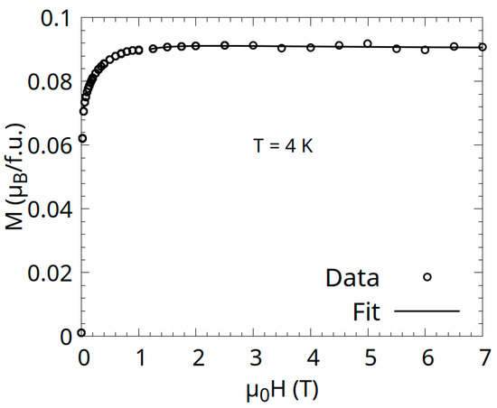 The magnetization curve measured at 4 K is shown in Figure 7. Spontaneous magnetization was determined to be 0.09 /f.u. for our sample, which is in complete agreement with the one found in the literature (0.09 /f.u—[12]).